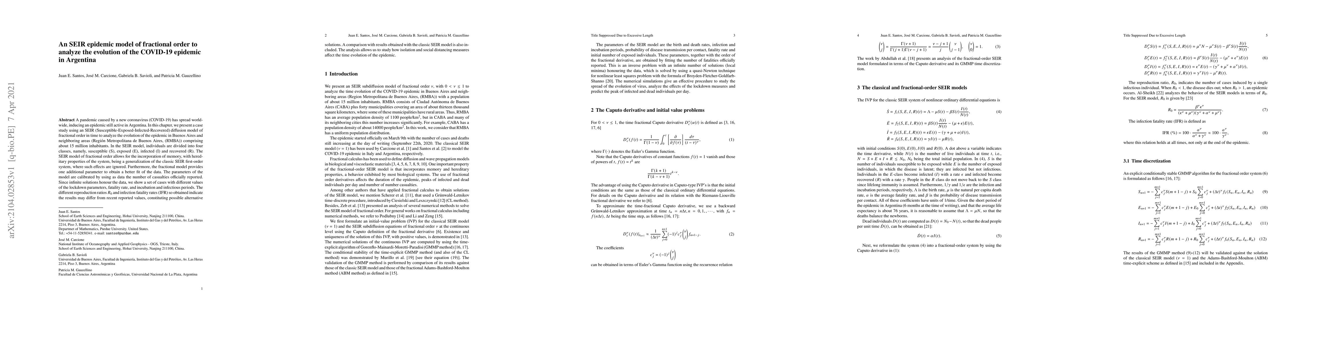 A pandemic caused by a new coronavirus (COVID-19) has spread worldwide, inducing an epidemic still active in Argentina. In this chapter, we present a case study using an SEIR (Susceptible-Exposed-Infected-Recovered) diffusion model of fractional order in time to analyze the evolution of the epidemic in Buenos Aires and neighboring areas (Regi\'on Metropolitana de Buenos Aires, (RMBA)) comprising about 15 million inhabitants. In the SEIR model, individuals are divided into four classes, namely, susceptible (S), exposed (E), infected (I) and recovered (R). The SEIR model of fractional order allows for the incorporation of memory, with hereditary properties of the system, being a generalization of the classic SEIR first-order system, where such effects are ignored. Furthermore, the fractional model provides one additional parameter to obtain a better fit of the data. The parameters of the model are calibrated by using as data the number of casualties officially reported. Since infinite solutions honour the data, we show a set of cases with different values of the lockdown parameters, fatality rate, and incubation and infectious periods. The different reproduction ratios R0 and infection fatality rates (IFR) so obtained indicate the results may differ from recent reported values, constituting possible alternative solutions. A comparison with results obtained with the classic SEIR model is also included. The analysis allows us to study how isolation and social distancing measures affect the time evolution of the epidemic.