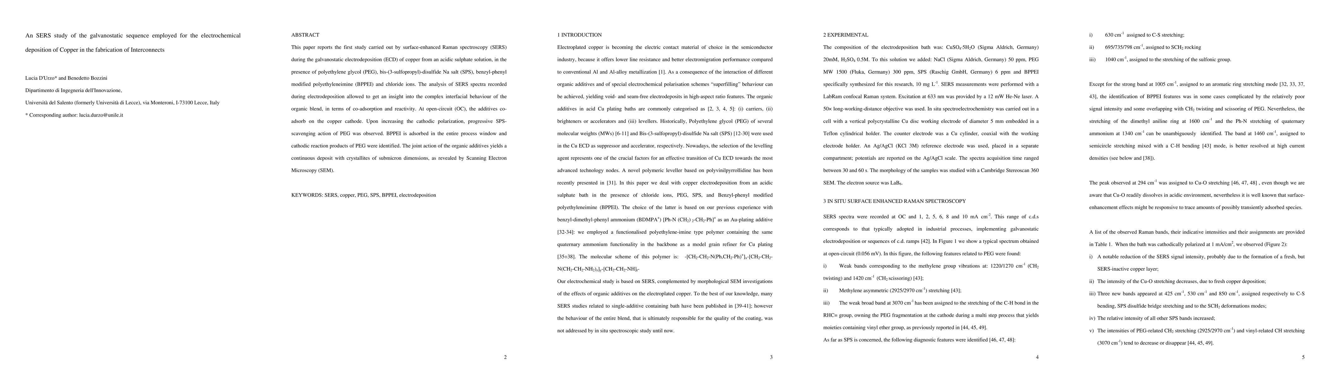 This paper uses SERS to analyze the galvanostatic electrodeposition of copper, revealing the co-adsorption and reactivity of organic additives during the process, and showing how PEG and BPPEI influence the formation of submicron crystallites in the deposit.