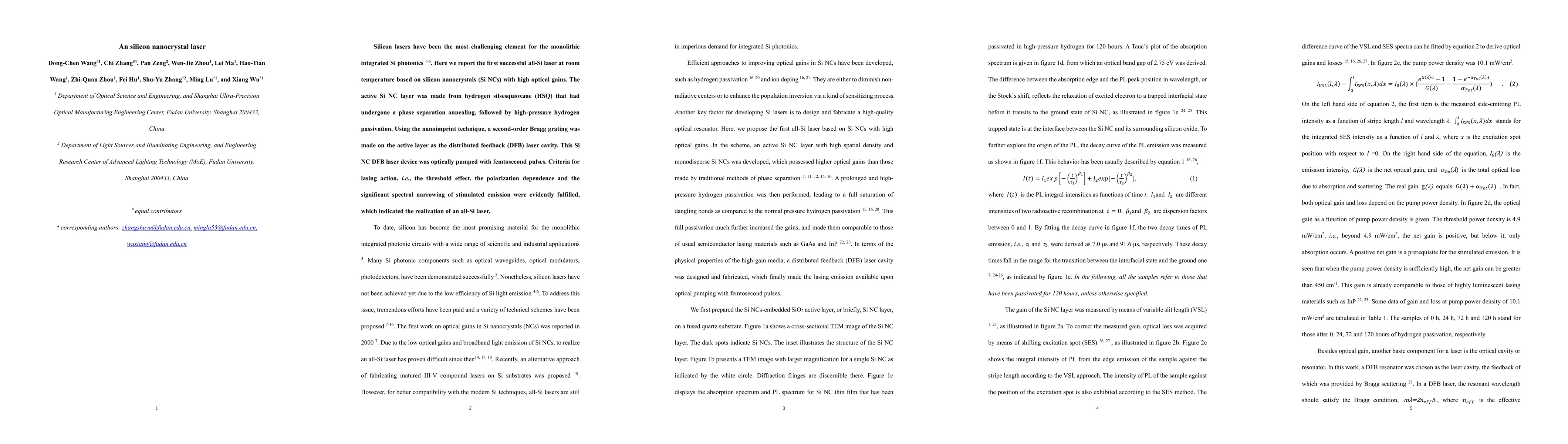 This paper reports the first successful room-temperature all-silicon laser based on silicon nanocrystals (Si NCs) with high optical gains, achieved through a combination of phase separation annealing and high-pressure hydrogen passivation. The device, a Si NC distributed feedback (DFB) laser, demonstrated lasing criteria including threshold effect, polarization dependence, and spectral narrowing.