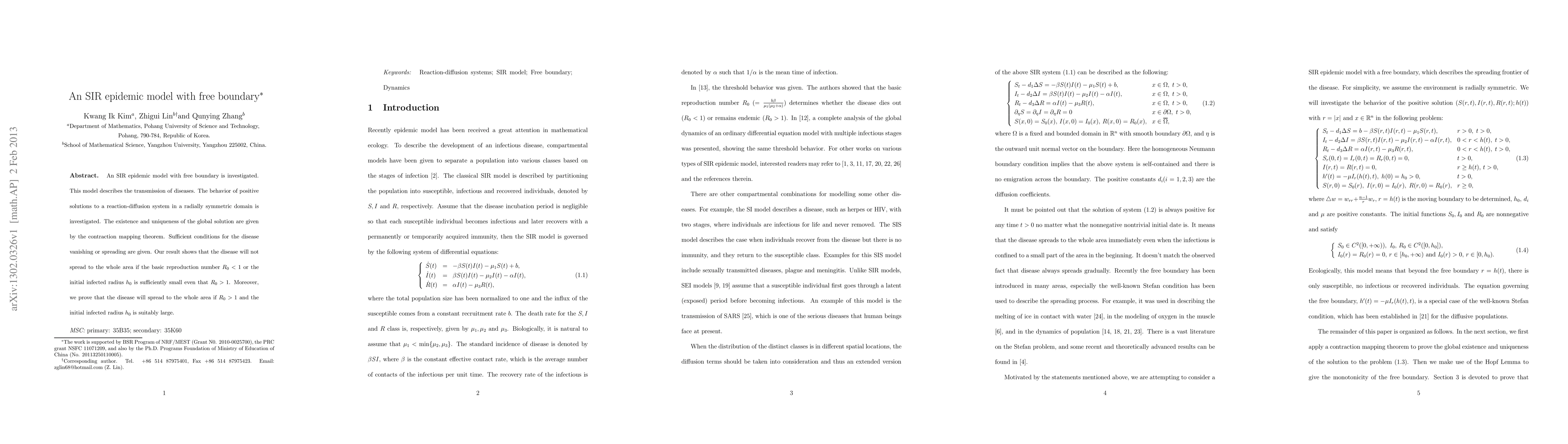 This paper investigates an SIR epidemic model with a free boundary, examining the dynamics of disease transmission through a reaction-diffusion system. It establishes conditions for disease spread or extinction based on the basic reproduction number and initial infected radius, showing that disease containment is possible if the reproduction number is below one or the initial infection is small.