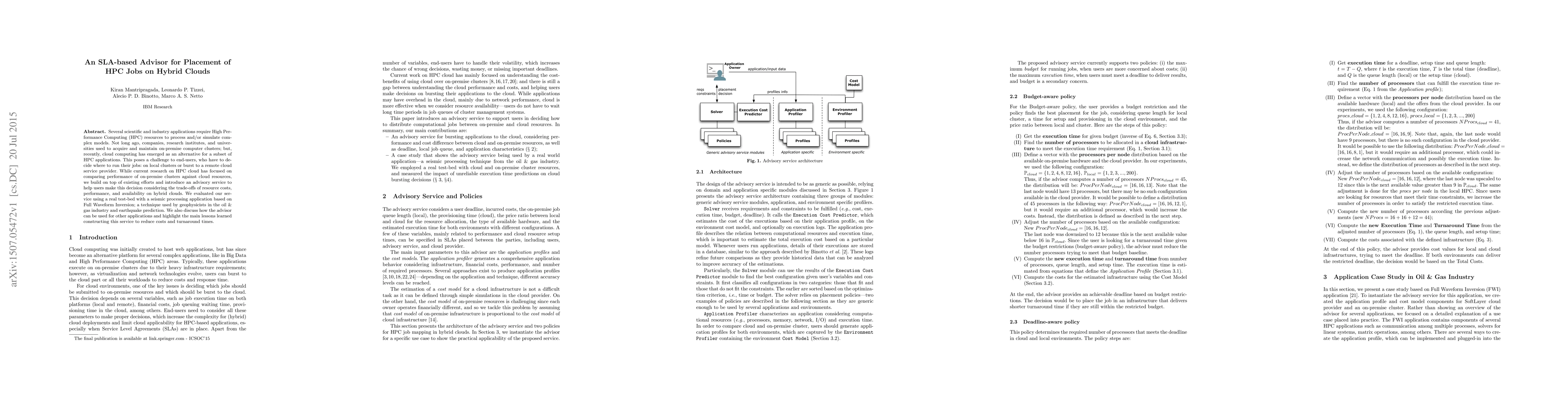 This paper proposes an SLA-based advisor for placing HPC jobs on hybrid clouds, helping users balance cost, performance, and availability. The service was evaluated using a seismic processing application, demonstrating its effectiveness in optimizing resource allocation.