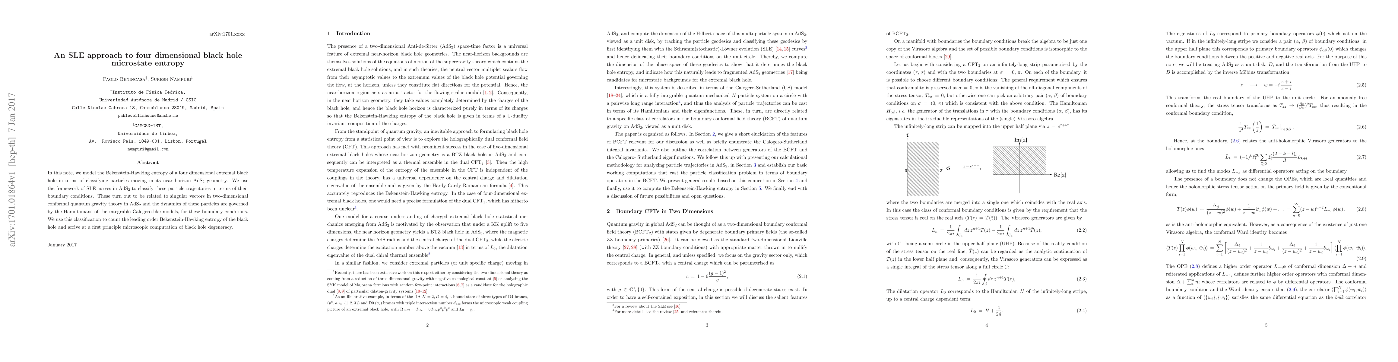 In this note, we model the Bekenstein-Hawking entropy of a four dimensional extremal black hole in terms of classifying particles moving in its near horizon AdS_2 geometry. We use the framework of SLE curves in AdS_2 to classify these particle trajectories in terms of their boundary conditions. These turn out to be related to singular vectors in two-dimensional conformal quantum gravity theory in AdS_2 and the dynamics of these particles are governed by the Hamiltonians of the integrable Calogero-like models, for these boundary conditions. We use this classification to count the leading order Bekenstein-Hawking entropy of the black hole and arrive at a first principle microscopic computation of black hole degeneracy.