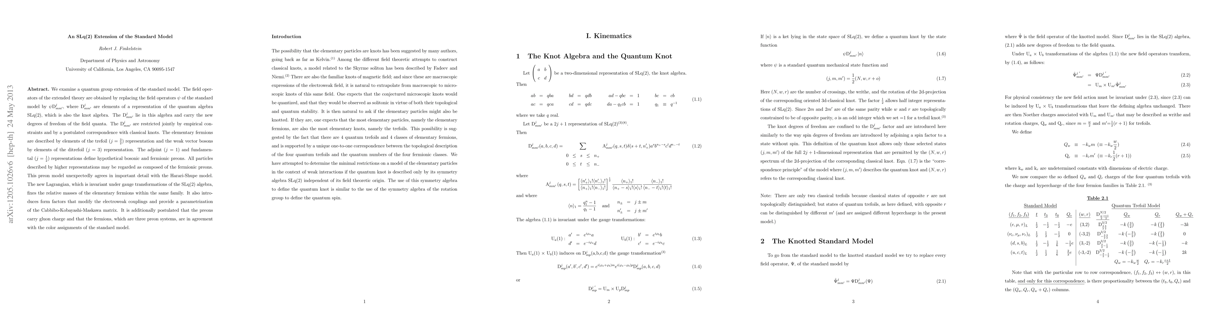 We examine a quantum group extension of the standard model. The field operators of the extended theory are obtained by replacing the field operators $\psi$ of the standard model by ${\psi}$D$^j_{mm'}$, where D$^{j}_{mm'}$ are elements of a representation of the quantum algebra SLq(2), which is also the knot algebra. The D$^j_{mm'}$ lie in this algebra and carry the new degrees of freedom of the field quanta. The D$^j_{mm'}$ are restricted jointly by empirical constraints and by a postulated correspondence with classical knots. The elementary fermions are described by elements of the trefoil ($j=\frac{3}{2}$) representation and the weak vector bosons by elements of the ditrefoil ($j=3$) representation. The adjoint ($j=1$) and fundamental ($j=\frac{1}{2}$) representations define hypothetical bosonic and fermionic preons. All particles described by higher representations may be regarded as composed of the fermionic preons. This preon model unexpectedly agrees in important detail with the Harari-Shupe model. The new Lagrangian, which is invariant under gauge transformations of the SLq(2) algebra, fixes the relative masses of the elementary fermions within the same family. It also introduces form factors that modify the electroweak couplings and provide a parametrization of the Cabbibo-Kobayashi-Maskawa matrix. It is additionally postulated that the preons carry gluon charge and that the fermions, which are three preon systems, are in agreement with the color assignments of the standard model.