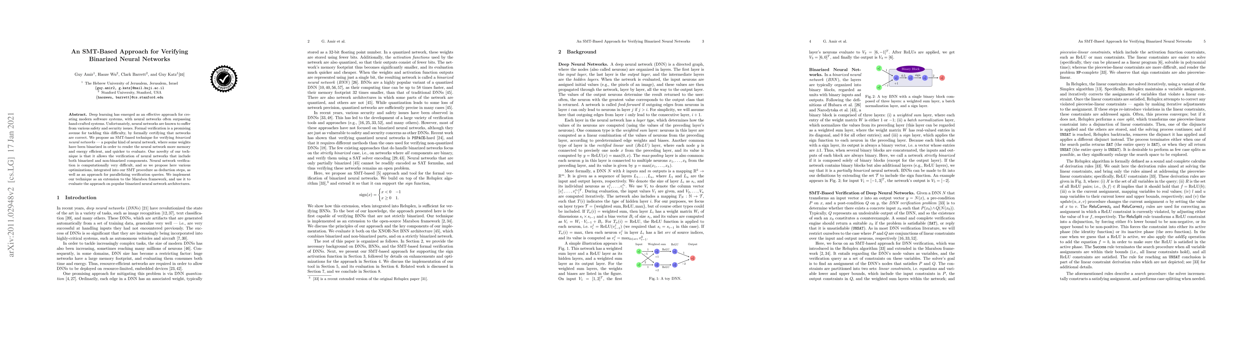 This paper proposes an SMT-based verification method for Binarized Neural Networks, addressing safety and security issues by ensuring correctness. The technique incorporates optimizations and parallelization to manage computational difficulties, and is implemented in the Marabou framework for practical evaluation.
