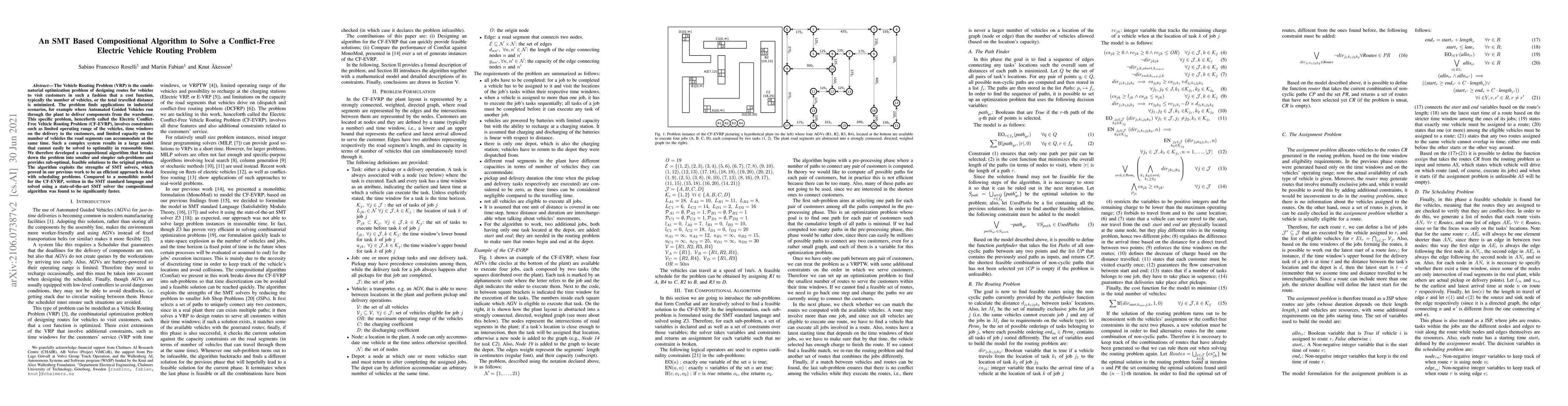 The Vehicle Routing Problem (VRP) is the combinatorial optimization problem of designing routes for vehicles to visit customers in such a fashion that a cost function, typically the number of vehicles, or the total travelled distance is minimized. The problem finds applications in industrial scenarios, for example where Automated Guided Vehicles run through the plant to deliver components from the warehouse. This specific problem, henceforth called the Electric Conflict-Free Vehicle Routing Problem (CF-EVRP), involves constraints such as limited operating range of the vehicles, time windows on the delivery to the customers, and limited capacity on the number of vehicles the road segments can accommodate at the same time. Such a complex system results in a large model that cannot easily be solved to optimality in reasonable time. We therefore developed a compositional model that breaks down the problem into smaller and simpler sub-problems and provides sub-optimal, feasible solutions to the original problem. The algorithm exploits the strengths of SMT solvers, which proved in our previous work to be an efficient approach to deal with scheduling problems. Compared to a monolithic model for the CF-EVRP, written in the SMT standard language and solved using a state-of-the-art SMT solver the compositional model was found to be significantly faster.