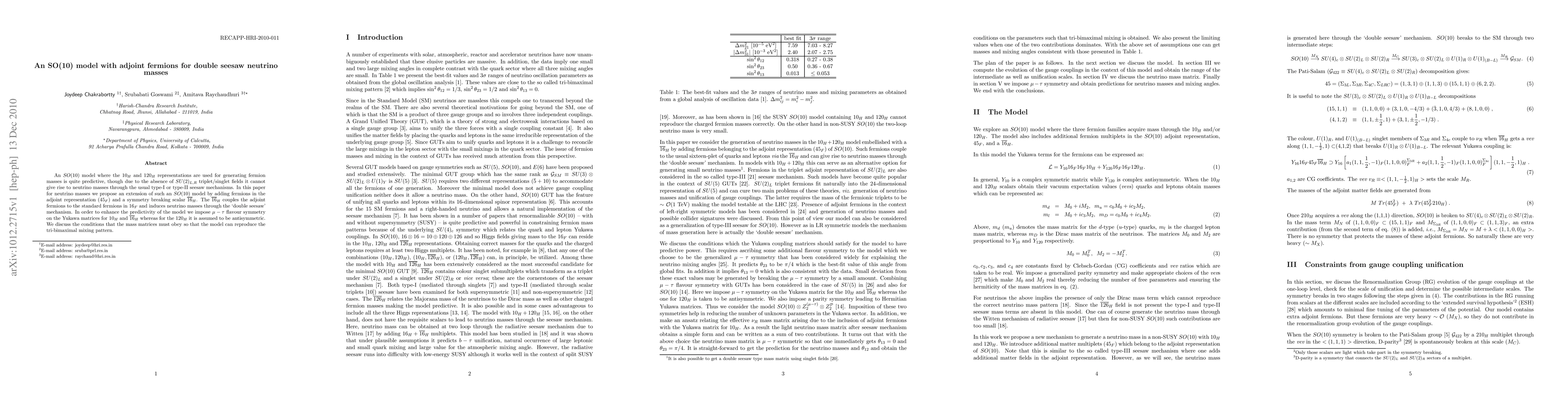An $SO(10)$ model where the $10_H$ and $120_H$ representations are used for generating fermion masses is quite predictive, though due to the absence of $SU(2)_{L,R}$ triplet/singlet fields it cannot give rise to neutrino masses through the usual type-I or type-II seesaw mechanisms. In this paper for neutrino masses we propose an extension of such an $SO(10)$ model by adding fermions in the adjoint representation (${45}_F$) and a symmetry breaking scalar $\bar{16}_H$. The $\bar{16}_H$ couples the adjoint fermions to the standard fermions in ${16}_F$ and induces neutrino masses through the `double seesaw' mechanism. In order to enhance the predictivity of the model we impose $\mu-\tau$ flavour symmetry on the Yukawa matrices for $10_H$ and $\bar{16}_H$ whereas for the $120_H$ it is assumed to be antisymmetric. We discuss the conditions that the mass matrices must obey so that the model can reproduce the tri-bimaximal mixing pattern.