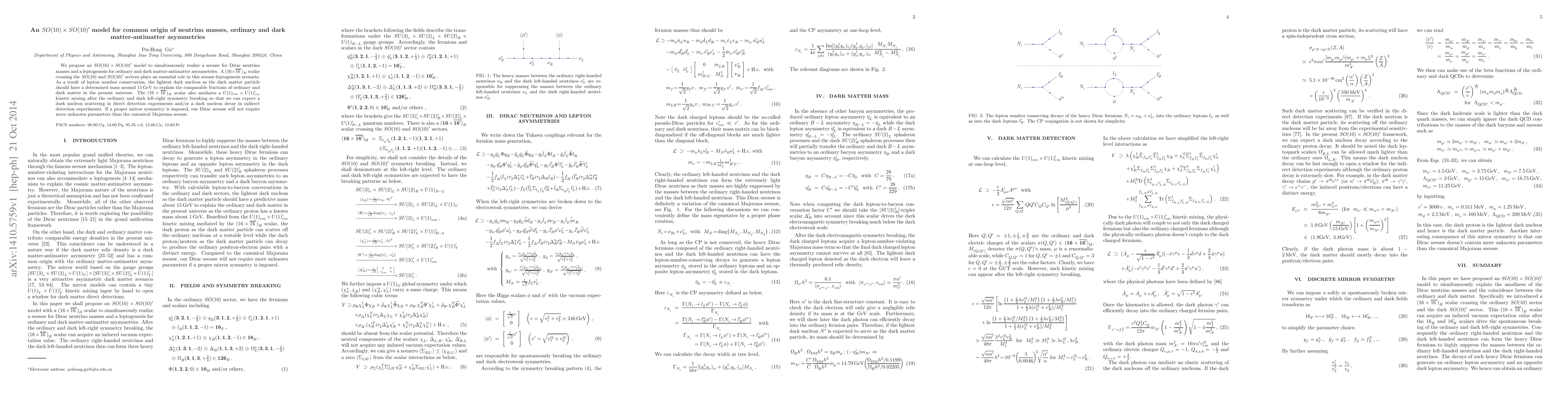 This paper proposes an SO(10) × SO(10)' model to explain the origin of neutrino masses via a seesaw mechanism and to generate both ordinary and dark matter-antimatter asymmetries through leptogenesis. The model predicts a dark nucleon with a mass around 15 GeV as dark matter, which could be detected in experiments.