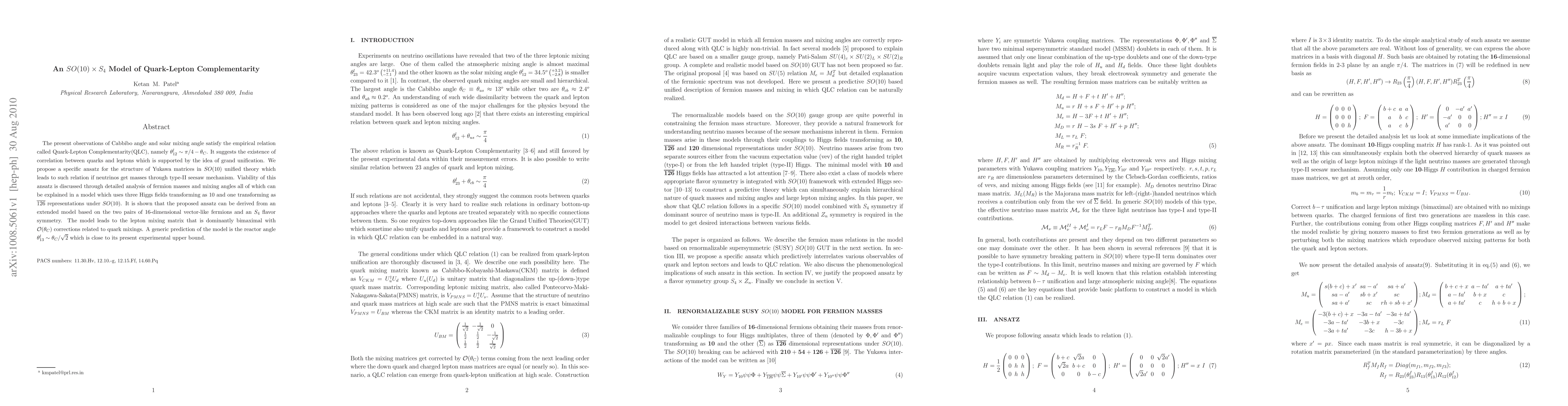 The present observations of Cabbibo angle and solar mixing angle satisfy the empirical relation called Quark-Lepton Complementarity(QLC), namely $\theta_{12}^l\sim \pi/4-\theta_C$. It suggests the existence of correlation between quarks and leptons which is supported by the idea of grand unification. We propose a specific ansatz for the structure of Yukawa matrices in SO(10) unified theory which leads to such relation if neutrinos get masses through type-II seesaw mechanism. Viability of this ansatz is discussed through detailed analysis of fermion masses and mixing angles all of which can be explained in a model which uses three Higgs fields transforming as 10 and one transforming as $\bar{126}$ representations under SO(10). It is shown that the proposed ansatz can be derived from an extended model based on the two pairs of 16-dimensional vector-like fermions and an $S_4$ flavor symmetry. The model leads to the lepton mixing matrix that is dominantly bimaximal with ${\cal O}(\theta_C)$ corrections related to quark mixing. A generic prediction of the model is the reactor angle $\theta_{13}^l\sim \theta_C/\sqrt{2}$ which is close to its present experimental upper bound.