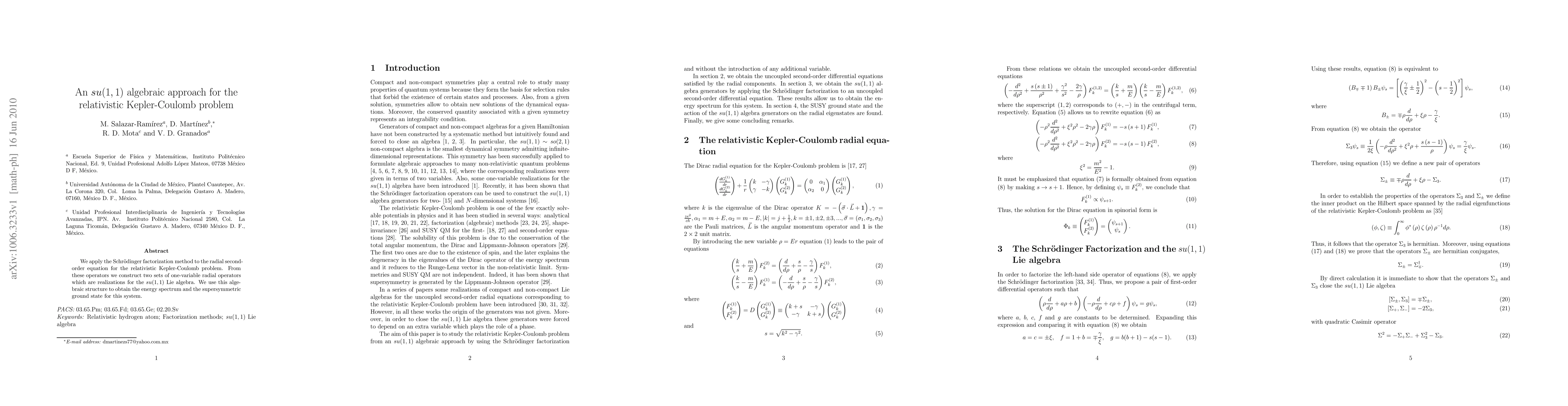 The paper uses the Schrödinger factorization method to derive radial operators corresponding to the $su(1,1)$ algebra for the relativistic Kepler-Coulomb problem, enabling the determination of its energy spectrum and supersymmetric ground state.