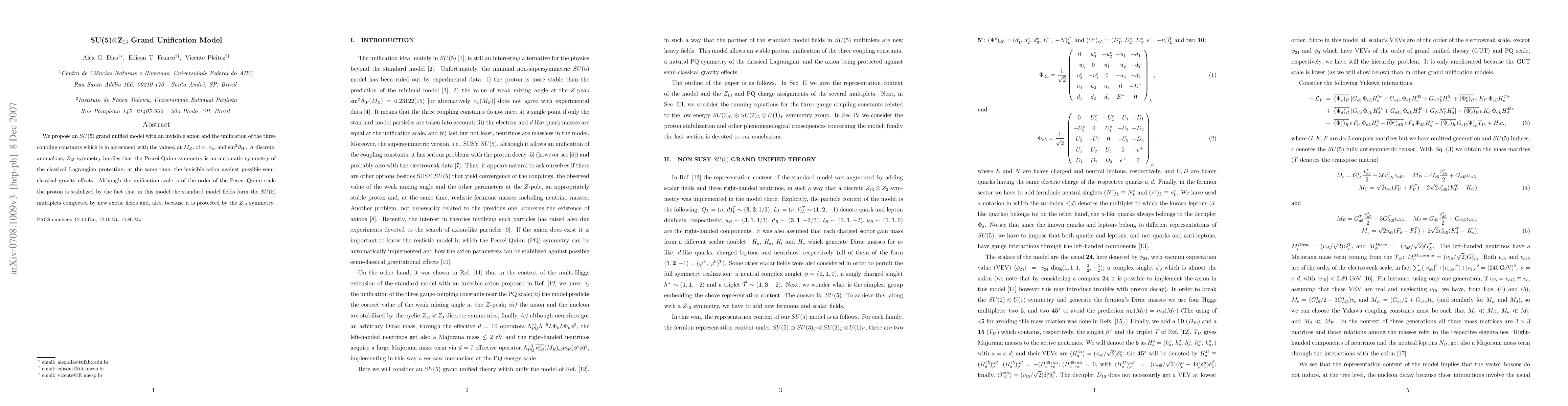 This paper proposes an SU(5) grand unified model incorporating an invisible axion and a $Z_{13}$ symmetry that ensures the unification of the three coupling constants at the Z boson mass scale. The Peccei-Quinn symmetry, protected by the $Z_{13}$ symmetry, stabilizes the proton and prevents semi-classical gravity effects.