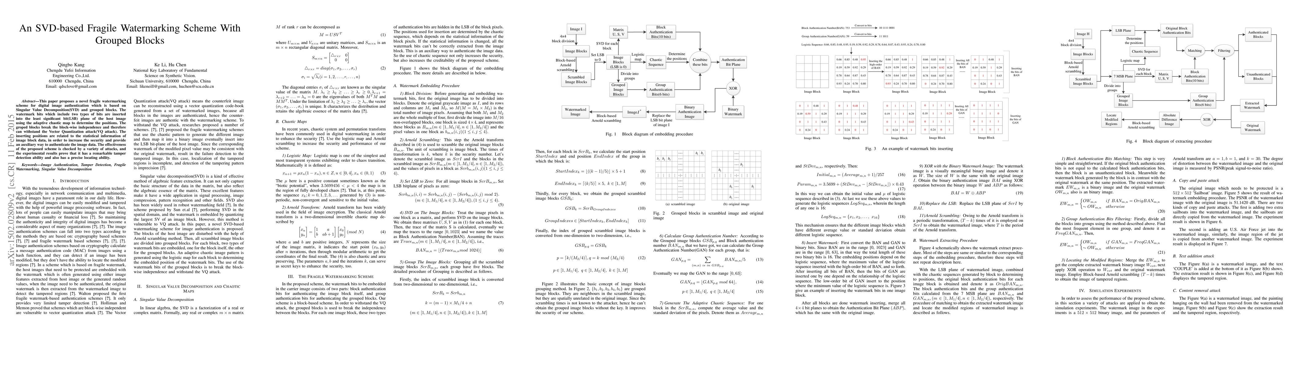 This paper introduces a novel SVD-based fragile watermarking scheme using grouped blocks for digital image authentication. The scheme employs SVD and adaptive chaotic maps to insert watermark bits into the host image, enhancing tamper detection and precise localization against various attacks.