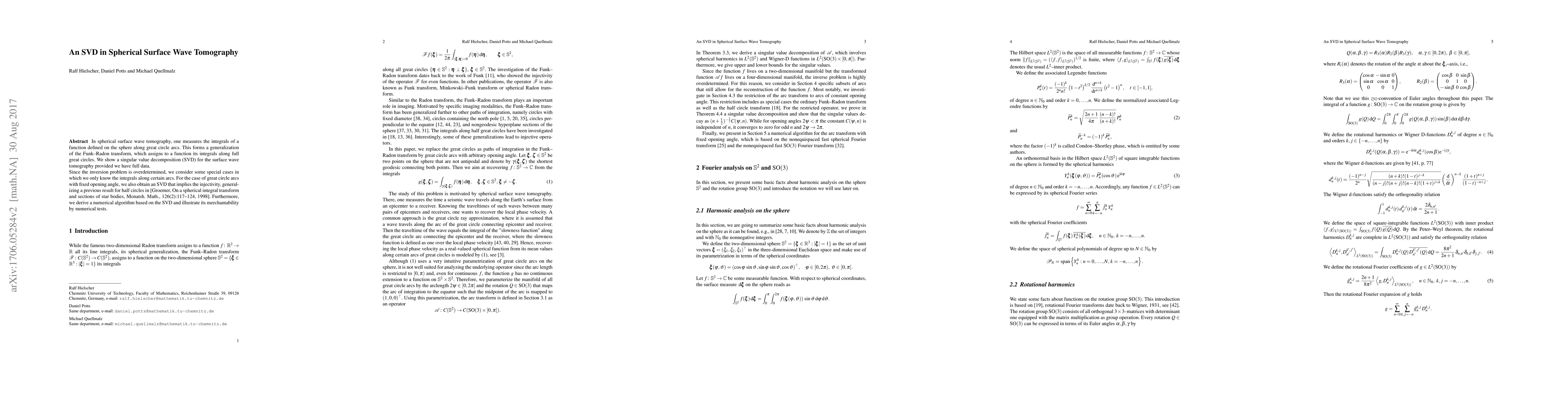 This paper presents a singular value decomposition (SVD) for spherical surface wave tomography, extending the Funk-Radon transform to integrals along great circle arcs. It also discusses inversion methods for incomplete data and proposes a numerical algorithm based on the SVD, validated through numerical tests.
