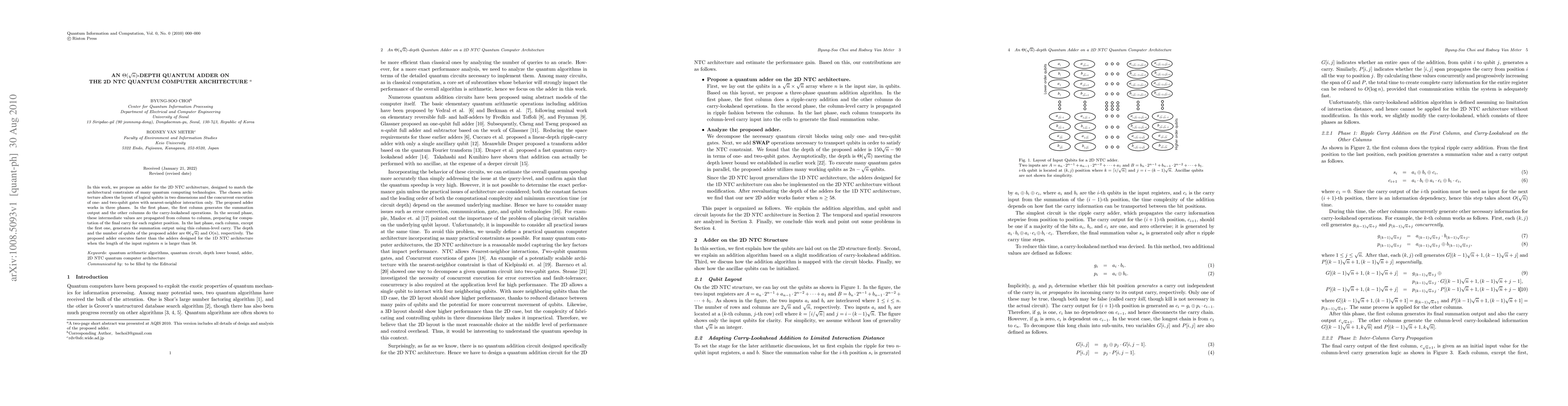 This paper introduces a quantum adder for a 2D NTC architecture, operating in three phases for efficient summation and carry-lookahead. Its depth and qubit count are Θ(√n) and O(n), respectively, outperforming 1D NTC adders for input register lengths n > 58.