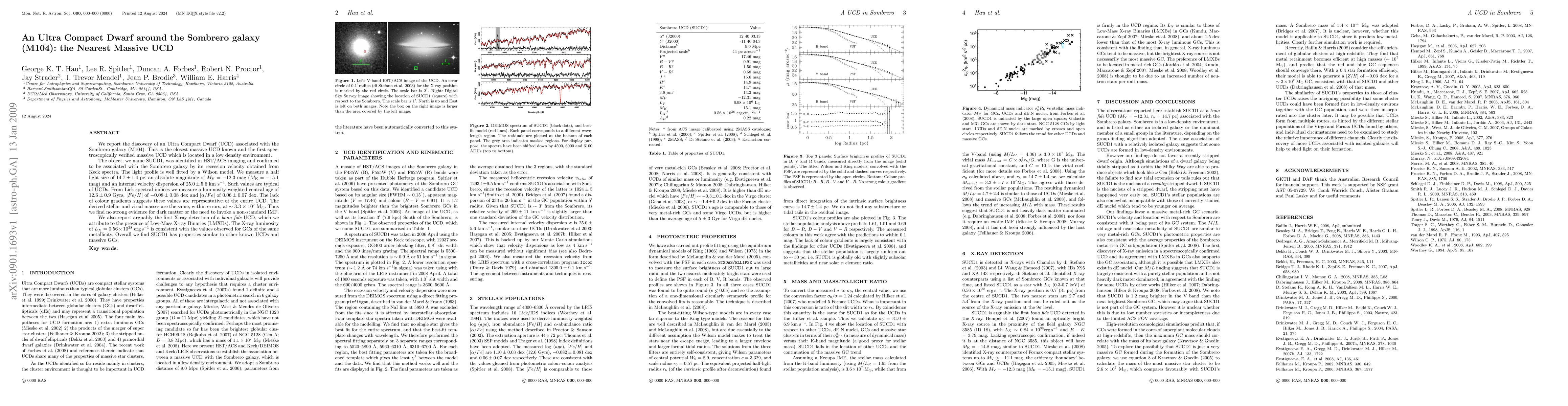 We report the discovery of an Ultra Compact Dwarf (UCD) associated with the Sombrero galaxy (M104). This is the closest massive UCD known and the first spectroscopically verified massive UCD which is located in a low density environment. The object, we name SUCD1, was identified in HST/ACS imaging and confirmed to be associated with the Sombrero galaxy by its recession velocity obtained from Keck spectra. The light profile is well fitted by a Wilson model. We measure a half light size of 14.7 +/- 1.4 pc, an absolute magnitude of M_V = -12.3 mag (M_K = -15.1 mag) and an internal velocity dispersion of 25.0 +/- 5.6 km/s. Such values are typical of UCDs. From Lick spectral indices we measure a luminosity-weighted central age of 12.6 +/- 0.9 Gyrs, [Fe/H] of -0.08 +/- 0.08 dex and [alpha/Fe] of 0.06 +/- 0.07 dex. The lack of colour gradients suggests these values are representative of the entire UCD. The derived stellar and virial masses are the same, within errors, at ~3.3 x 10E7 Msun. Thus we find no strong evidence for dark matter or the need to invoke a non-standard IMF. We also report arguably the first X-ray detection of a bona fide UCD, which we attribute to the presence of Low-Mass X-ray Binaries (LMXBs). The X-ray luminosity of L_X = 0.56 x 10E38 erg/s is consistent with the values observed for GCs of the same metallicity. Overall we find SUCD1 has properties similar to other known UCDs and massive GCs.