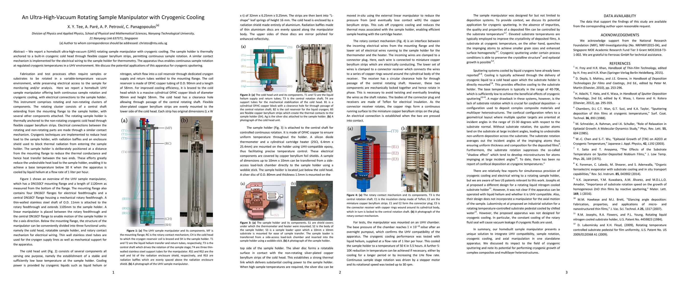 This paper describes a custom-built ultra-high-vacuum rotating sample manipulator equipped with cryogenic cooling, allowing continuous sample rotation and thermometry at cryogenic temperatures. The device's potential applications include cryogenic sputtering processes.