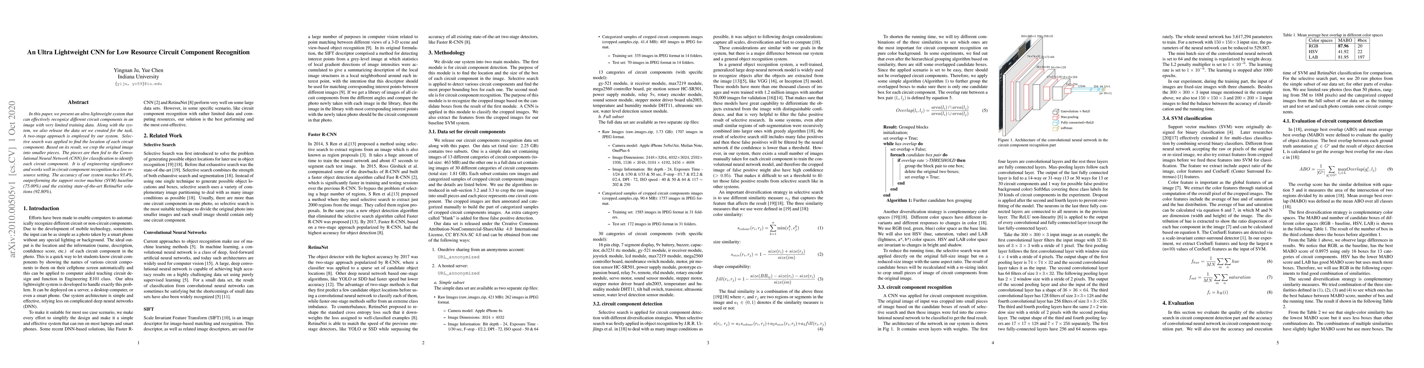 In this paper, we present an ultra lightweight system that can effectively recognize different circuit components in an image with very limited training data. Along with the system, we also release the data set we created for the task. A two-stage approach is employed by our system. Selective search was applied to find the location of each circuit component. Based on its result, we crop the original image into smaller pieces. The pieces are then fed to the Convolutional Neural Network (CNN) for classification to identify each circuit component. It is of engineering significance and works well in circuit component recognition in a low resource setting. The accuracy of our system reaches 93.4\%, outperforming the support vector machine (SVM) baseline (75.00%) and the existing state-of-the-art RetinaNet solutions (92.80%).