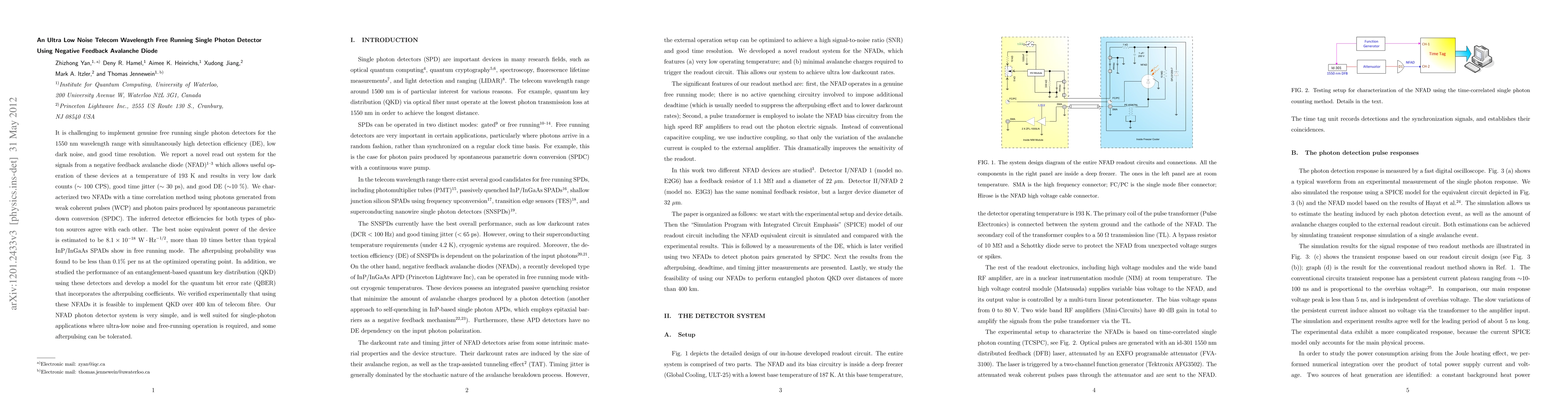 This paper presents an ultra-low noise, free-running single photon detector based on a negative feedback avalanche diode (NFAD) operating at 1550 nm with low dark counts, good detection efficiency, and time resolution. The NFAD detector shows promising performance for quantum key distribution over long distances.