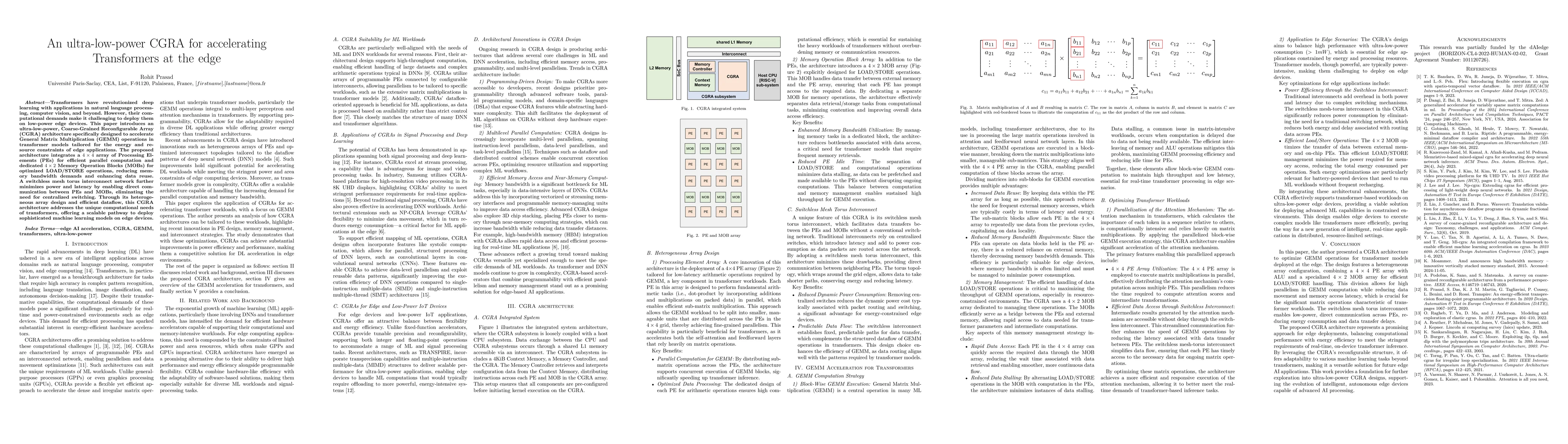 Transformers have revolutionized deep learning with applications in natural language processing, computer vision, and beyond. However, their computational demands make it challenging to deploy them on low-power edge devices. This paper introduces an ultra-low-power, Coarse-Grained Reconfigurable Array (CGRA) architecture specifically designed to accelerate General Matrix Multiplication (GEMM) operations in transformer models tailored for the energy and resource constraints of edge applications. The proposed architecture integrates a 4 x 4 array of Processing Elements (PEs) for efficient parallel computation and dedicated 4 x 2 Memory Operation Blocks (MOBs) for optimized LOAD/STORE operations, reducing memory bandwidth demands and enhancing data reuse. A switchless mesh torus interconnect network further minimizes power and latency by enabling direct communication between PEs and MOBs, eliminating the need for centralized switching. Through its heterogeneous array design and efficient dataflow, this CGRA architecture addresses the unique computational needs of transformers, offering a scalable pathway to deploy sophisticated machine learning models on edge devices.