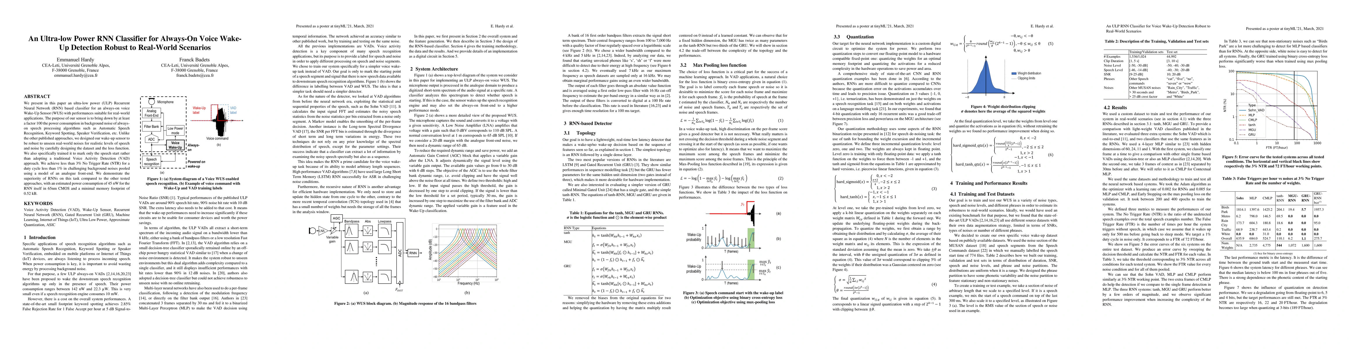 Researchers developed an ultra-low power RNN classifier for voice wake-up detection that is robust to real-world noises and achieves low power consumption of 45 nW.