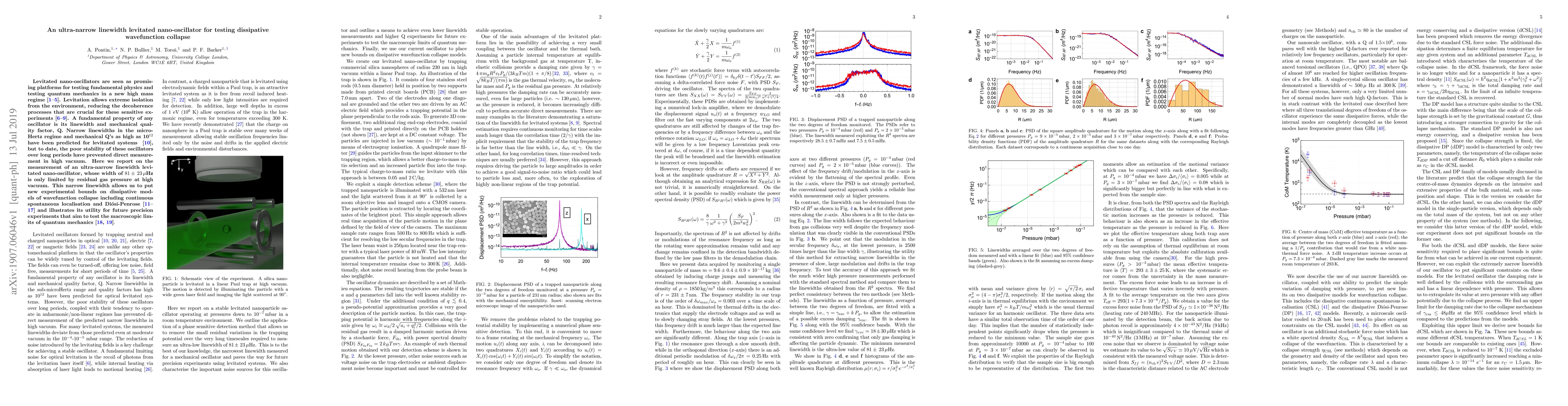 This paper reports the measurement of an ultra-narrow line width levitated nano-oscillator with a line width of $81\pm\,23\,\mu$Hz, enabling new experimental bounds on dissipative wavefunction collapse models and demonstrating its potential for future quantum mechanics tests.