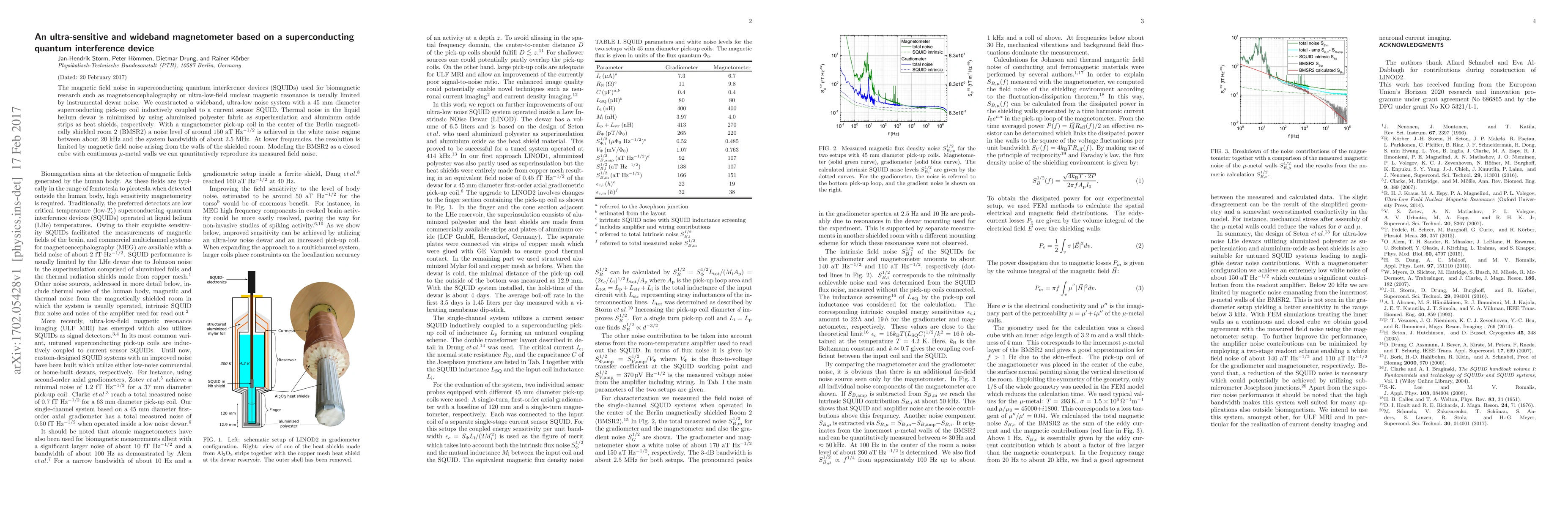 The magnetic field noise in superconducting quantum interference devices (SQUIDs) used for biomagnetic research such as magnetoencephalography or ultra-low-field nuclear magnetic resonance is usually limited by instrumental dewar noise. We constructed a wideband, ultra-low noise system with a 45 mm diameter superconducting pick-up coil inductively coupled to a current sensor SQUID. Thermal noise in the liquid helium dewar is minimized by using aluminized polyester fabric as superinsulation and aluminum oxide strips as heat shields, respectively. With a magnetometer pick-up coil in the center of the Berlin magneti- cally shielded room 2 (BMSR2) a noise level of around 150 aT Hz$^{-1/2}$ is achieved in the white noise regime between about 20 kHz and the system bandwidth of about 2.5 MHz. At lower frequencies, the resolution is limited by magnetic field noise arising from the walls of the shielded room. Modeling the BMSR2 as a closed cube with continuous \mu-metal walls we can quantitatively reproduce its measured field noise.