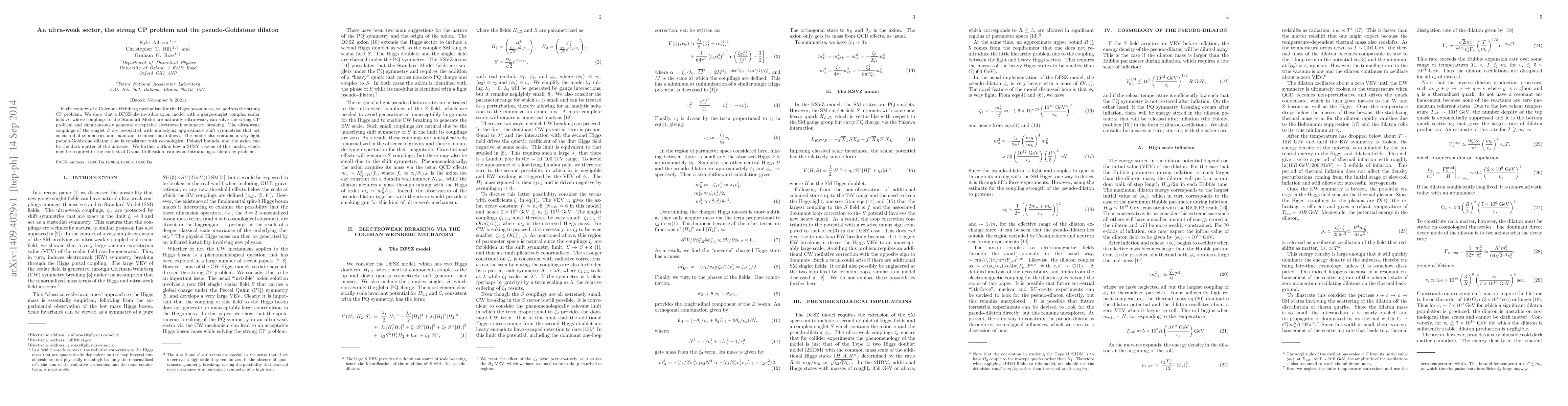 In the context of a Coleman-Weinberg mechanism for the Higgs boson mass, we address the strong CP problem. We show that a DFSZ-like invisible axion model with a gauge-singlet complex scalar field S, whose couplings to the Standard Model are naturally ultra-weak, can solve the strong CP problem and simultaneously generate acceptable electroweak symmetry breaking. The ultra-weak couplings of the singlet S are associated with underlying approximate shift symmetries that act as custodial symmetries and maintain technical naturalness. The model also contains a very light pseudo-Goldstone dilaton that is consistent with cosmological Polonyi bounds, and the axion can be the dark matter of the universe. We further outline how a SUSY version of this model, which may be required in the context of Grand Unification, can avoid introducing a hierarchy problem.