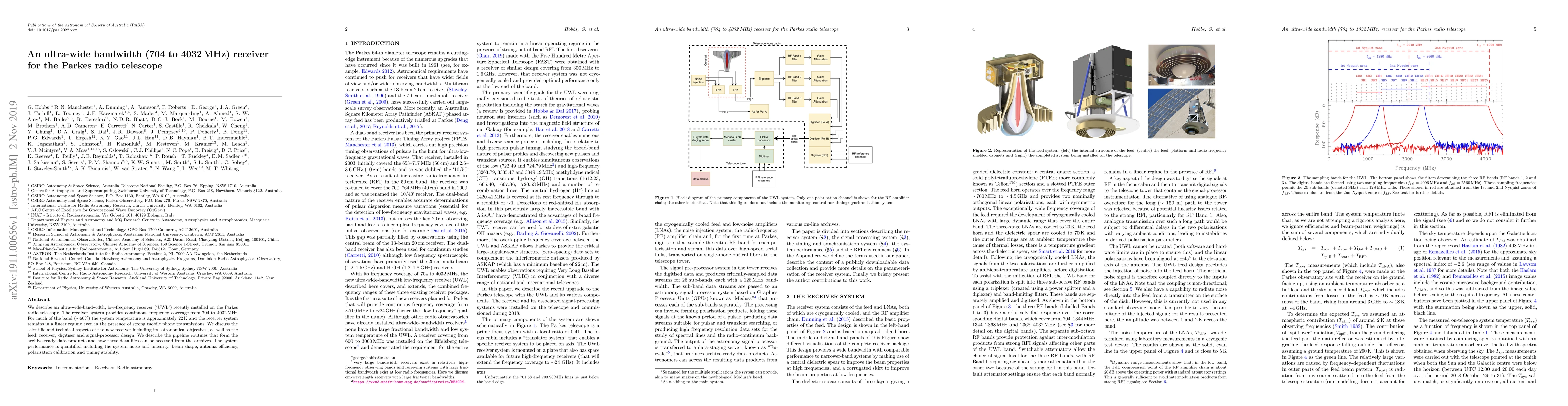 This paper details an ultra-wide-bandwidth receiver installed on the Parkes radio telescope, providing continuous coverage from 704 to 4032 MHz with a system temperature of ~22K. The receiver maintains linearity even amidst strong mobile phone interference, and outlines its design, performance metrics, and data access protocols.