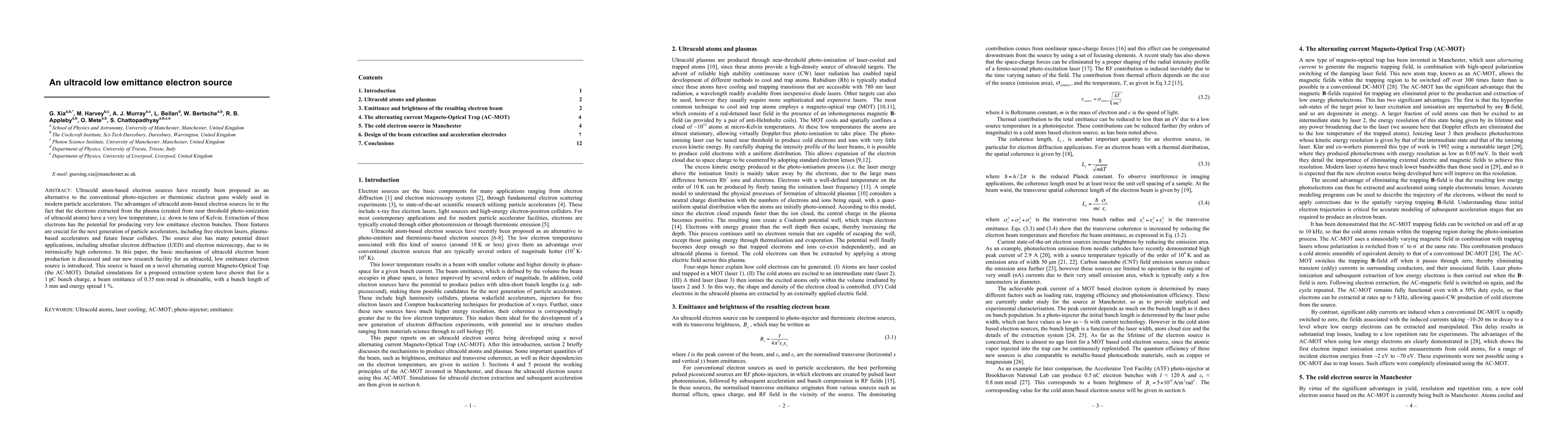 Ultracold atom-based electron sources have recently been proposed as an alternative to the conventional photo-injectors or thermionic electron guns widely used in modern particle accelerators. The advantages of ultracold atom-based electron sources lie in the fact that the electrons extracted from the plasma (created from near threshold photo-ionization of ultracold atoms) have a very low temperature, i.e. down to tens of Kelvin. Extraction of these electrons has the potential for producing very low emittance electron bunches. These features are crucial for the next generation of particle accelerators, including free electron lasers, plasma-based accelerators and future linear colliders. The source also has many potential direct applications, including ultrafast electron diffraction (UED) and electron microscopy, due to its intrinsically high coherence. In this paper, the basic mechanism of ultracold electron beam production is discussed and our new research facility for an ultracold, low emittance electron source is introduced. This source is based on a novel alternating current Magneto-Optical Trap (the AC-MOT). Detailed simulations for a proposed extraction system have shown that for a 1 pC bunch charge, a beam emittance of 0.35 mm mrad is obtainable, with a bunch length of 3 mm and energy spread 1 %.