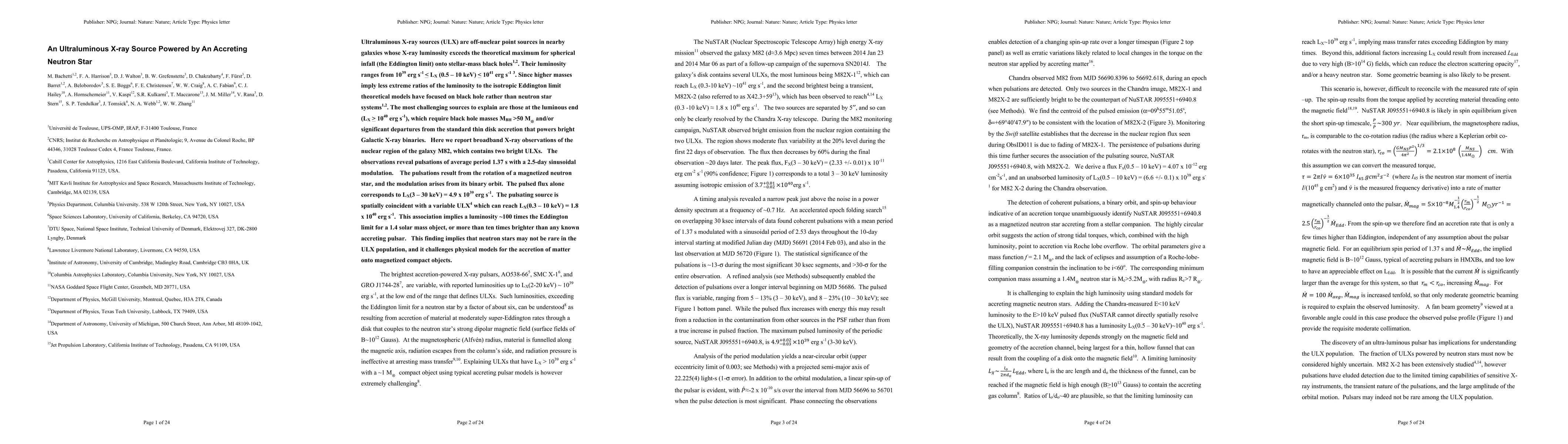 This paper presents X-ray observations of an ultraluminous X-ray source in M82, revealing pulsations indicative of a rotating magnetized neutron star, challenging existing models that favor black holes for such high luminosities. The findings suggest neutron stars can be significant contributors to the ULX population.
