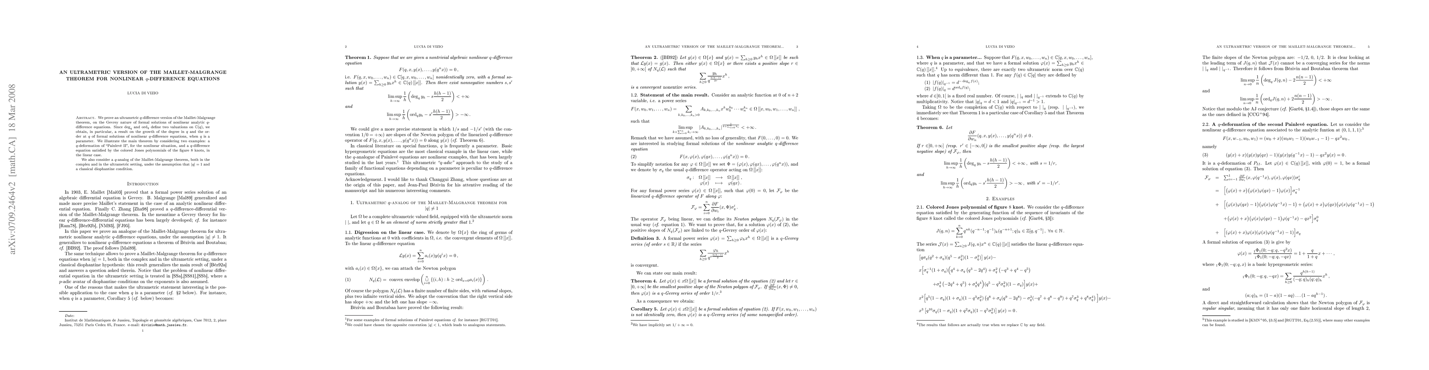 Summary: This paper proves an ultrametric version of the Maillet-Malgrange theorem for nonlinear q-difference equations, demonstrating the Gevrey nature of their formal solutions and analyzing the growth of the degree and order in q. It also includes examples of q-deformations of Painlevé equations and q-difference equations related to colored Jones polynomials.