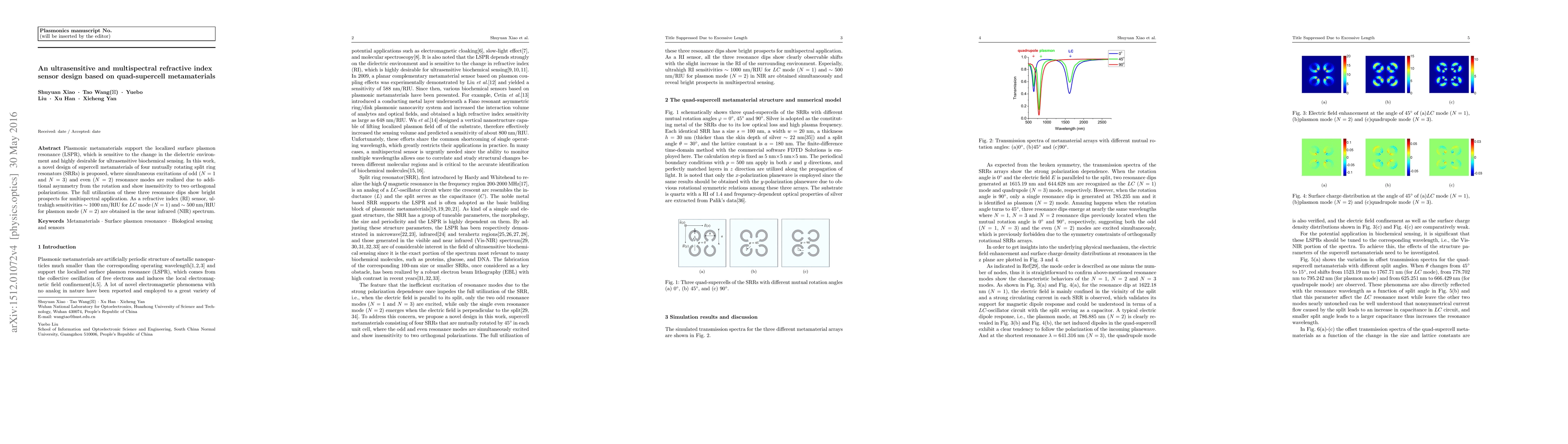 Plasmonic metamaterials support the localized surface plasmon resonance (LSPR), which is sensitive to the change in the dielectric environment and highly desirable for ultrasensitive biochemical sensing. In this work, a novel design of supercell metamaterials of four mutually rotating split ring resonators (SRRs) is proposed, where simultaneous excitations of odd (N=1 and N = 3) and even (N=2) resonance modes are realized due to additional asymmetry from the rotation and show insensitivity to two orthogonal polarizations. The full utilization of these three resonance dips show bright prospects for multispectral application. As a refractive index (RI) sensor, ultrahigh sensitivities ~1000nm/RIU for LC mode (N=1) and ~500nm/RIU for plasmon mode (N=2) are obtained in near infrared (NIR) spectrum.