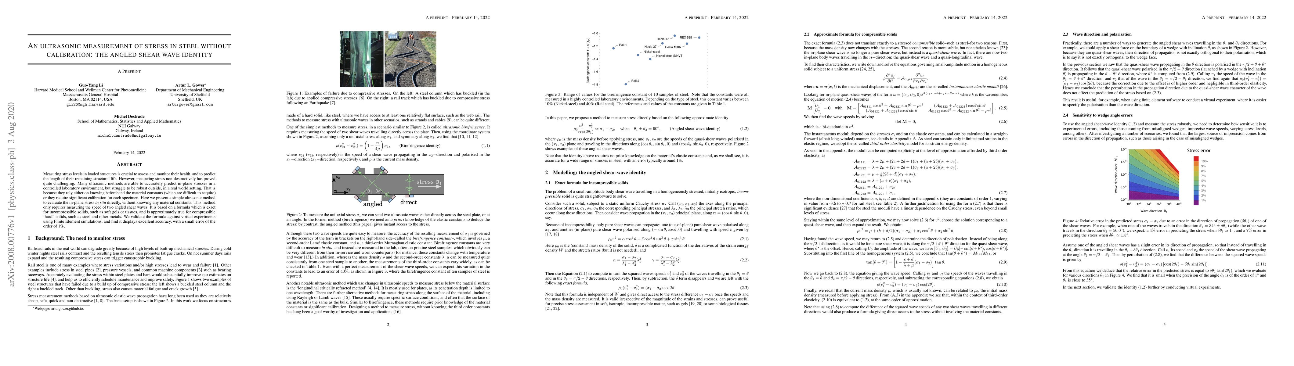 This paper introduces an ultrasonic method for measuring in-plane stress in steel without calibration, relying on the speed of two angled shear waves. The method, validated through Finite Element simulations, shows high accuracy with minimal error, offering a robust solution for non-destructive stress assessment in real-world settings.