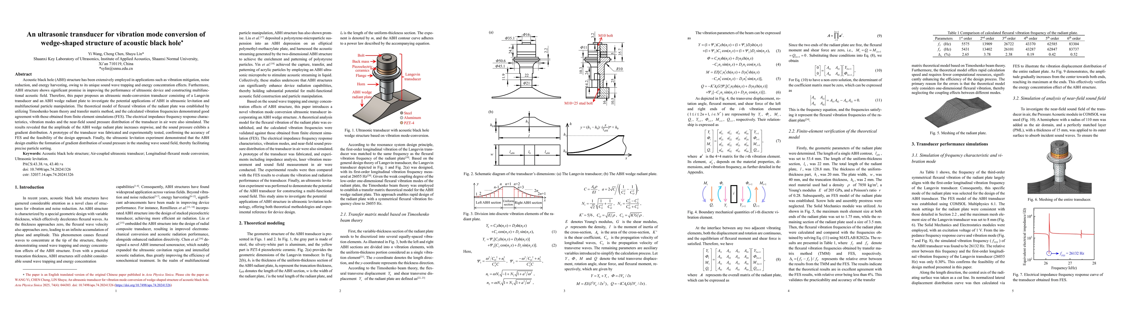Acoustic black hole (ABH) structure has been extensively employed in applications such as vibration mitigation, noise reduction, and energy harvesting, owing to its unique sound wave trapping and energy concentration effects. Furthermore, ABH structure shows significant promise in improving the performance of ultrasonic device and constructing multifunc-tional acoustic field. Therefore, this paper proposes an ultrasonic mode-conversion transducer consisting of a Langevin transducer and an ABH wedge radiant plate to investigate the potential applications of ABH in ultrasonic levitation and multifunctional particle manipulation. The theoretical model of flexural vibration of the radiant plate is established by utilizing Timoshenko beam theory and transfer matrix method, and the calculated vibration frequencies demonstrated good agreement with those obtained from finite element simulations (FES). The electrical impedance frequency response characteristics, vibration modes and the near-field sound pressure distribution of the transducer in air were also simulated. The results revealed that the amplitude of the ABH wedge radiant plate increases stepwise, and the sound pressure exhibits a gradient distribution. A prototype of the transducer was fabricated and experimentally tested, confirming the accuracy of FES and the feasibility of the design approach. Finally, the ultrasonic levitation experiment demonstrated that the ABH design enables the formation of gradient distribution of sound pressure in the standing wave sound field, thereby facilitating precise particle sorting.