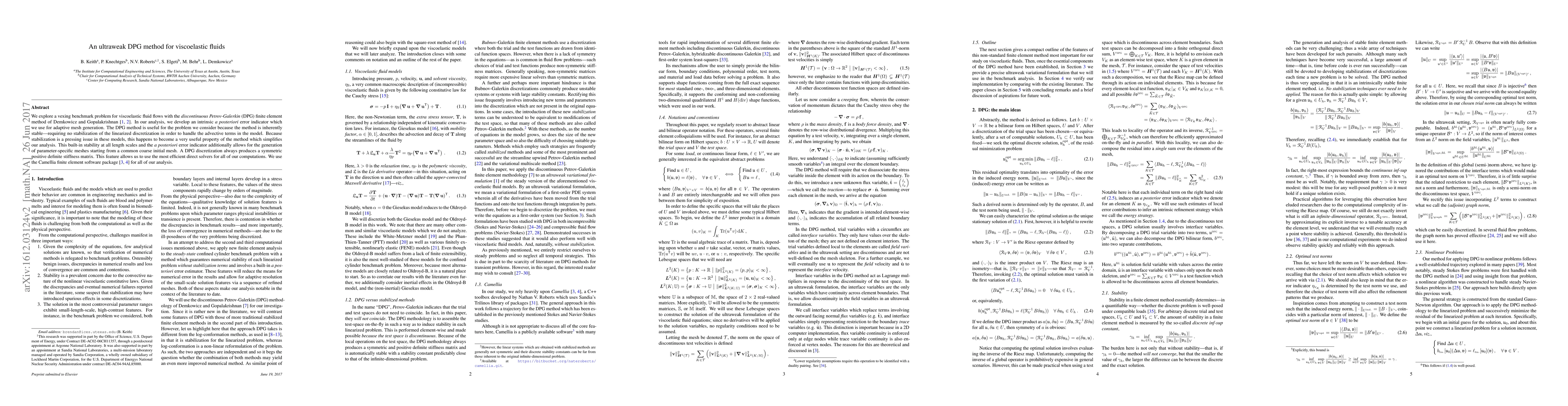 We explore a vexing benchmark problem for viscoelastic fluid flows with the discontinuous Petrov-Galerkin (DPG) finite element method of Demkowicz and Gopalakrishnan [1,2]. In our analysis, we develop an intrinsic a posteriori error indicator which we use for adaptive mesh generation. The DPG method is useful for the problem we consider because the method is inherently stable---requiring no stabilization of the linearized discretization in order to handle the advective terms in the model. Because stabilization is a pressing issue in these models, this happens to become a very useful property of the method which simplifies our analysis. This built-in stability at all length scales and the a posteriori error indicator additionally allows for the generation of parameter-specific meshes starting from a common coarse initial mesh. A DPG discretization always produces a symmetric positive definite stiffness matrix. This feature allows us to use the most efficient direct solvers for all of our computations. We use the Camellia finite element software package [3,4] for all of our analysis.