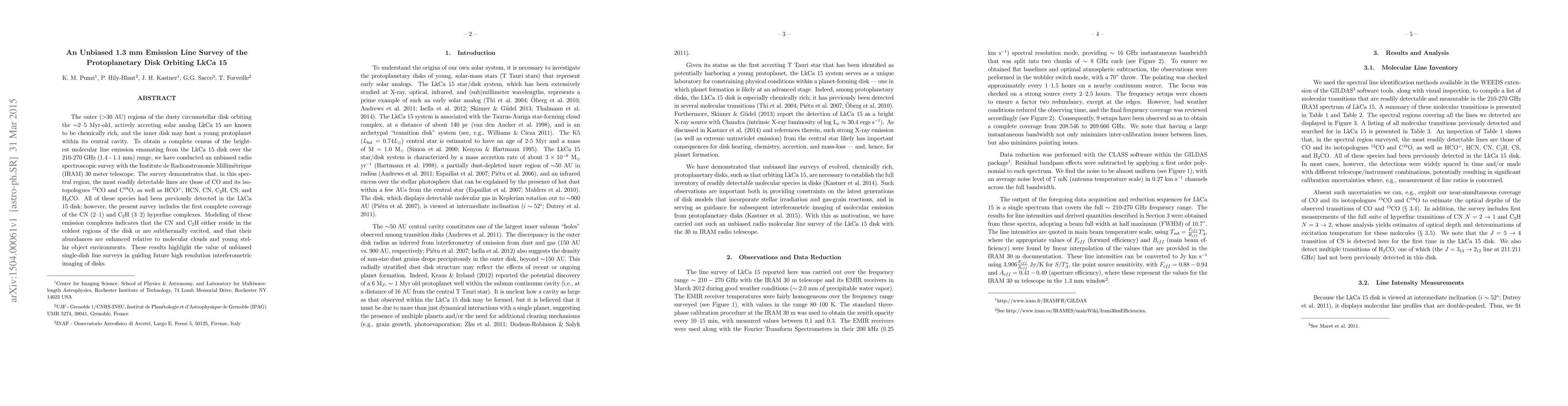 A radio spectroscopic survey of the LkCa 15 disk revealed emission from various molecules, including CO, CN, and C2H, which suggest enhanced abundances in the coldest regions or subthermal excitation.