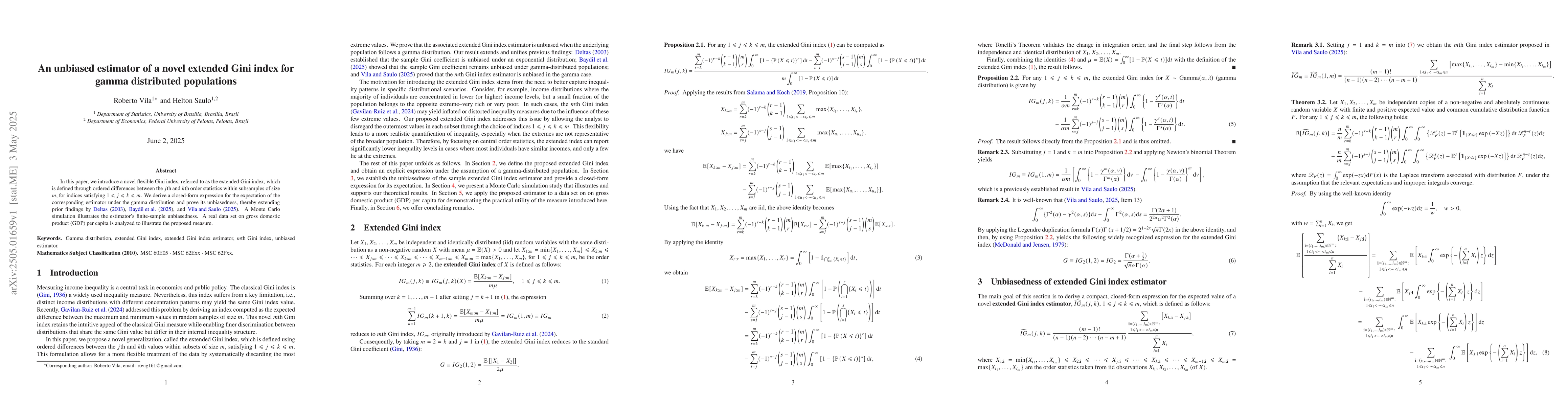 This paper introduces a novel extended Gini index for gamma-distributed populations, providing a closed-form expression for its expectation under the gamma distribution and proving its unbiasedness through simulation.
