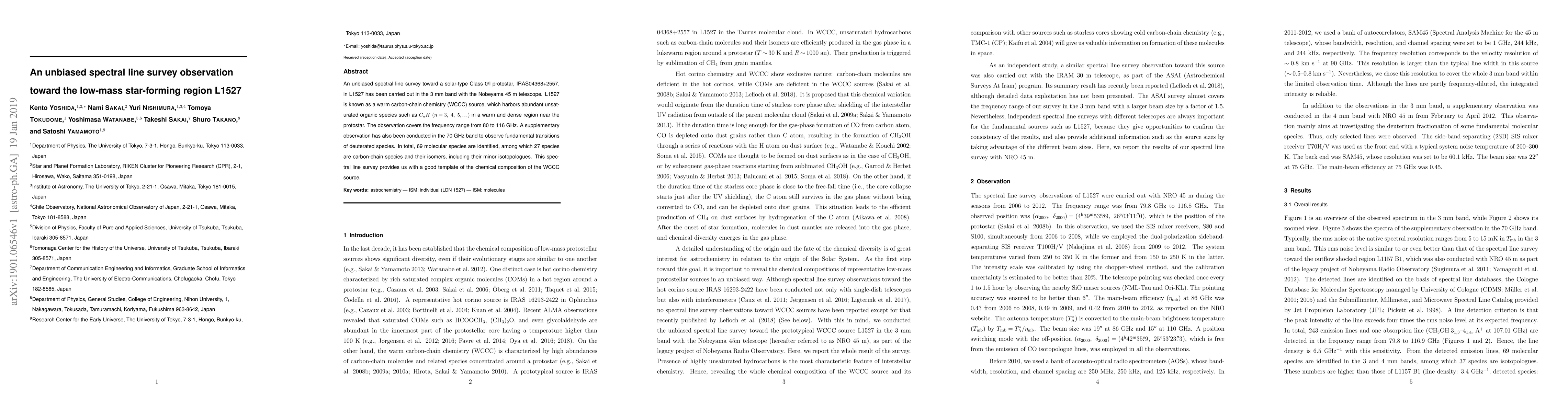 An unbiased spectral line survey toward a solar-type Class 0/I protostar, IRAS04368+2557, in L1527 has been carried out in the 3 mm band with the Nobeyama 45 m telescope. L1527 is known as a warm carbon-chain chemistry (WCCC) source, which harbors abundant unsaturated organic species such as C$_n$H ($n = 3,\ 4,\ 5,\ldots$) in a warm and dense region near the protostar. The observation covers the frequency range from 80 to 116 GHz. A supplementary observation has also been conducted in the 70 GHz band to observe fundamental transitions of deuterated species. In total, 69 molecular species are identified, among which 27 species are carbon-chain species and their isomers, including their minor isotopologues. This spectral line survey provides us with a good template of the chemical composition of the WCCC source.