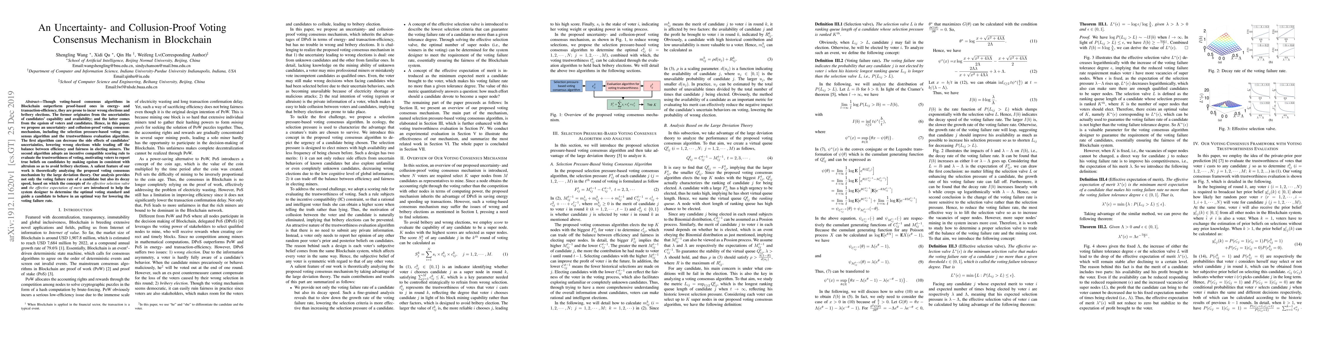 Though voting-based consensus algorithms in Blockchain outperform proof-based ones in energy- and transaction-efficiency, they are prone to incur wrong elections and bribery elections. The former originates from the uncertainties of candidates' capability and availability; and the latter comes from the egoism of voters and candidates. Hence, in this paper, we propose an uncertainty- and collusion-proof voting consensus mechanism, including the selection pressure-based voting consensus algorithm and the trustworthiness evaluation algorithm. The first algorithm can decrease the side effects of candidates' uncertainties, lowering wrong elections while trading off the balance between efficiency and fairness in electing miners. The second algorithm adopts an incentive compatible scoring rule to evaluate the trustworthiness of voting, motivating voters to report true beliefs on candidates by making egoism in consistent with altruism so as to avoid bribery elections. A salient feature of our work is theoretically analyzing the proposed voting consensus mechanism by the large deviation theory. Our analysis provides not only the voting failure rate of a candidate but also its decay speed, based on which the concepts of {\it the effective selection valve} and {\it the effective expectation of merit} are introduced to help the system designer to determine the optimal voting standard and guide a candidate to behave in an optimal way for lowering the voting failure rate.