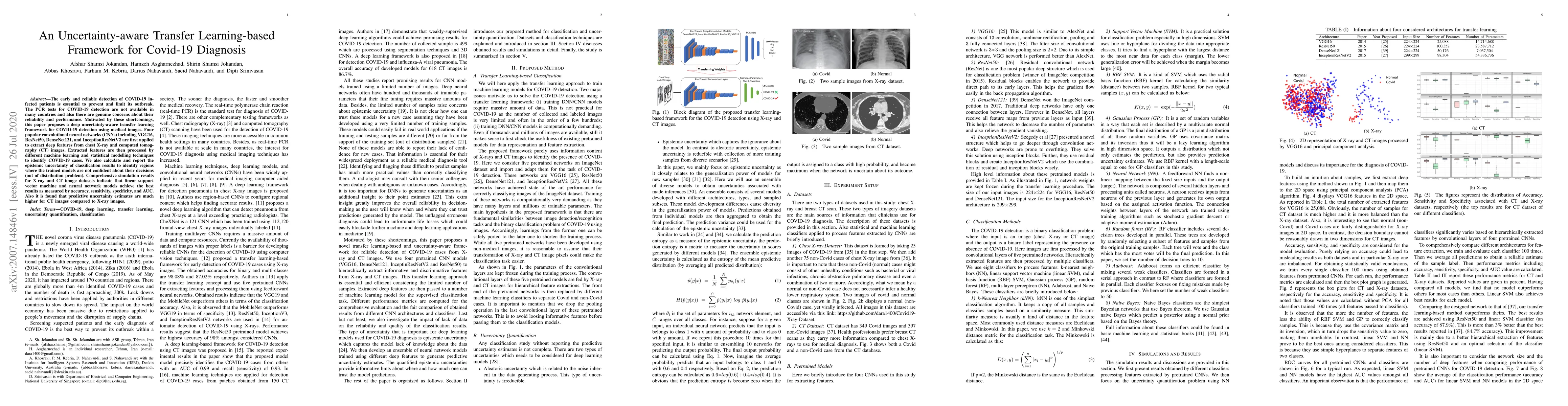 The early and reliable detection of COVID-19 infected patients is essential to prevent and limit its outbreak. The PCR tests for COVID-19 detection are not available in many countries and also there are genuine concerns about their reliability and performance. Motivated by these shortcomings, this paper proposes a deep uncertainty-aware transfer learning framework for COVID-19 detection using medical images. Four popular convolutional neural networks (CNNs) including VGG16, ResNet50, DenseNet121, and InceptionResNetV2 are first applied to extract deep features from chest X-ray and computed tomography (CT) images. Extracted features are then processed by different machine learning and statistical modelling techniques to identify COVID-19 cases. We also calculate and report the epistemic uncertainty of classification results to identify regions where the trained models are not confident about their decisions (out of distribution problem). Comprehensive simulation results for X-ray and CT image datasets indicate that linear support vector machine and neural network models achieve the best results as measured by accuracy, sensitivity, specificity, and AUC. Also it is found that predictive uncertainty estimates are much higher for CT images compared to X-ray images.