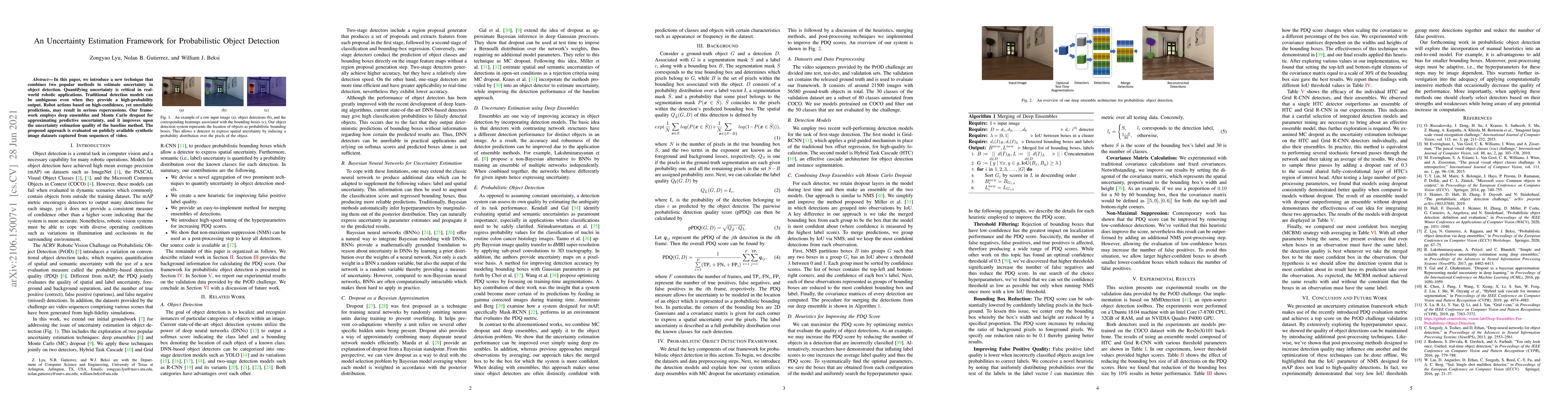 In this paper, we introduce a new technique that combines two popular methods to estimate uncertainty in object detection. Quantifying uncertainty is critical in real-world robotic applications. Traditional detection models can be ambiguous even when they provide a high-probability output. Robot actions based on high-confidence, yet unreliable predictions, may result in serious repercussions. Our framework employs deep ensembles and Monte Carlo dropout for approximating predictive uncertainty, and it improves upon the uncertainty estimation quality of the baseline method. The proposed approach is evaluated on publicly available synthetic image datasets captured from sequences of video.