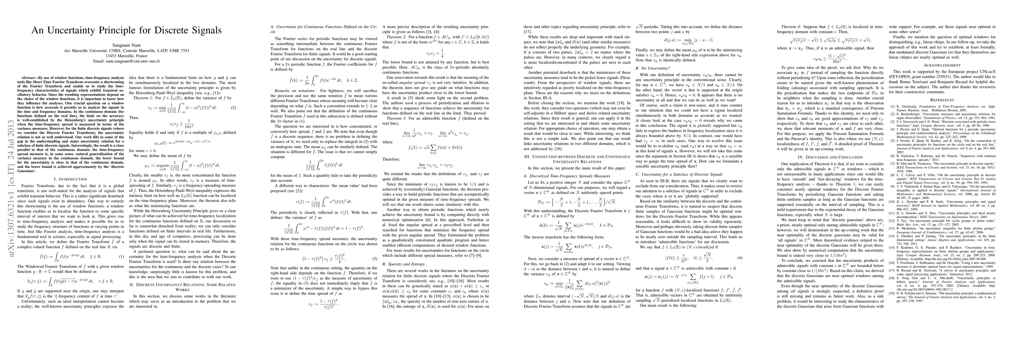 This paper establishes an uncertainty principle for discrete signals using window functions, revealing a lower bound on time-frequency spread similar to the continuous domain, with 'discrete Gaussians' achieving this bound approximately.