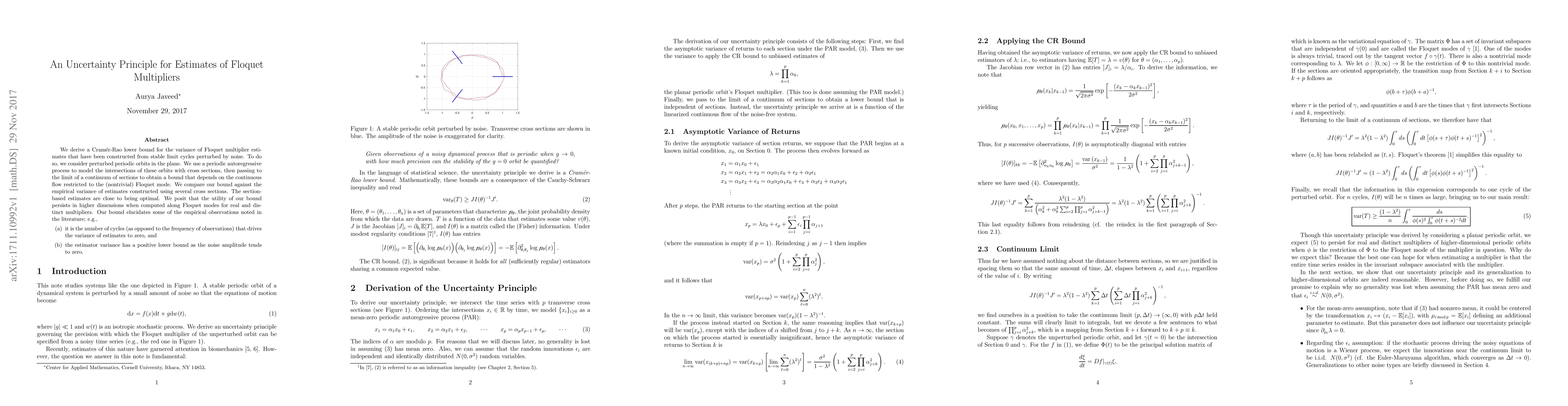 The research derives a Cramér-Rao lower bound for the variance of Floquet multiplier estimates using stable limit cycles perturbed by noise. It models periodic orbit intersections with cross sections using a periodic autoregressive process, then takes the limit to a continuum of sections to obtain a bound dependent on the continuous flow restricted to the Floquet mode.
