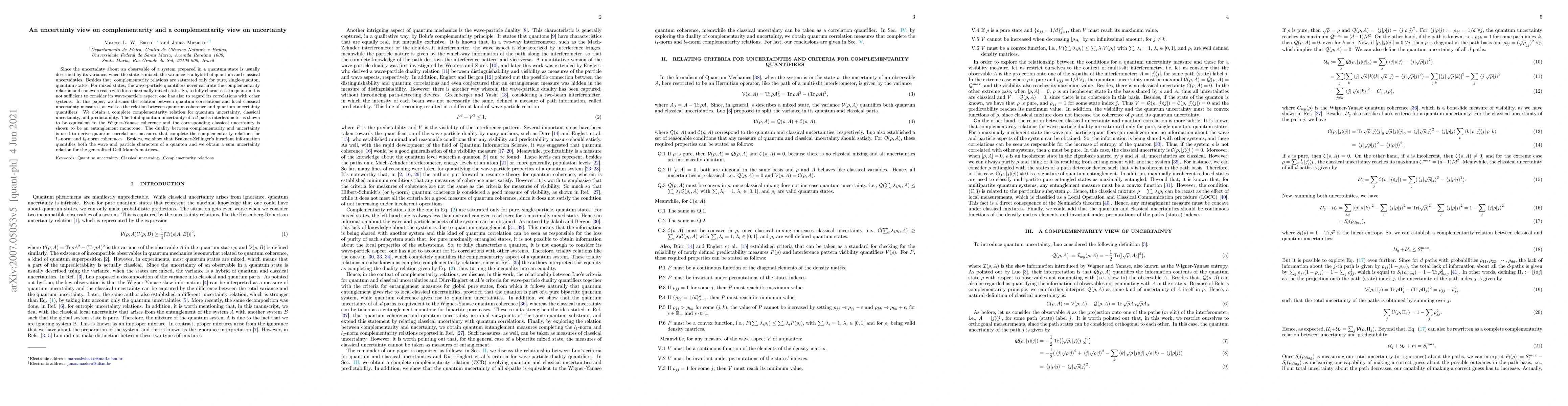 Since the uncertainty about an observable of a system prepared in a quantum state is usually described by its variance, when the state is mixed, the variance is a hybrid of quantum and classical uncertainties. Besides that, complementarity relations are saturated only for pure, single-quanton, quantum states. For mixed states, the wave-particle quantifiers never saturate the complementarity relation and can even reach zero for a maximally mixed state. So, to fully characterize a quanton it is not sufficient to consider its wave-particle aspect; one has also to regard its correlations with other systems. In this paper, we discuss the relation between quantum correlations and local classical uncertainty measures, as well as the relation between quantum coherence and quantum uncertainty quantifiers. We obtain a complete complementarity relation for quantum uncertainty, classical uncertainty, and predictability. The total quantum uncertainty of a d-paths interferometer is shown to be equivalent to the Wigner-Yanase coherence and the corresponding classical uncertainty is shown to be a quantum correlation quantifier. The duality between complementarity and uncertainty is used to derive quantum correlations measures that complete the complementarity relations for $l_1$-norm and $l_2$-norm coherences. Besides, we show that Brukner-Zeilinger's invariant information quantifies both the wave and particle characters of a quanton and we obtain a sum uncertainty relation for the generalized Gell Mann's matrices.