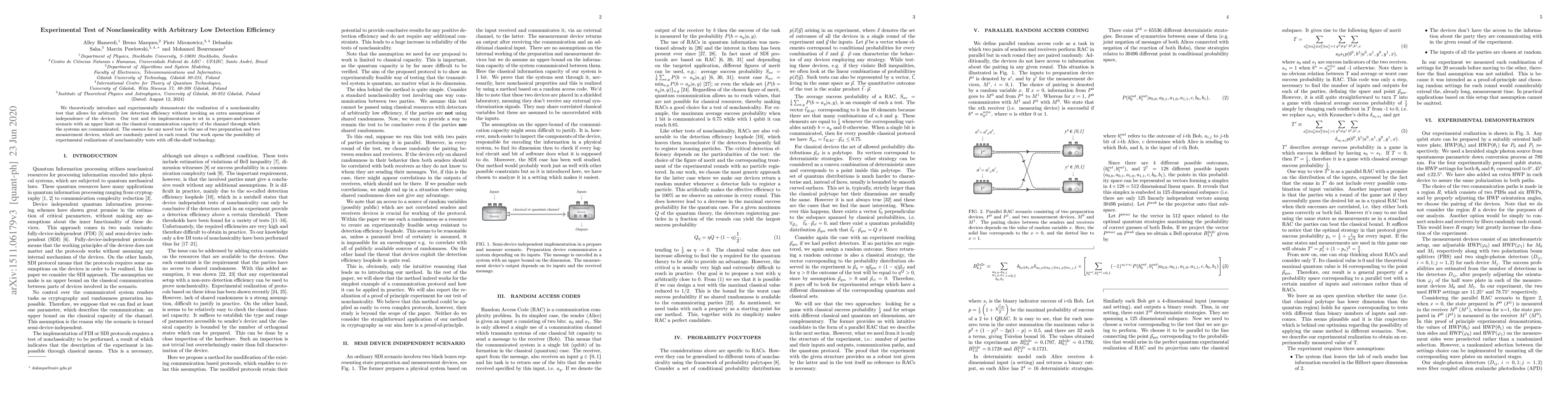 We theoretically introduce and experimentally demonstrate the realization of a nonclassicality test that allows for arbitrarily low detection efficiency without invoking any extra assumptions as independence of the devices. Our test and its implementation is set in a prepare-and-measure scenario with an upper limit on the communication capacity of the channel through which the systems are communicated. The essence for our novel test is the use of two preparation and two measurement devices, which are randomly paired in each round. Our work opens up the possibility of experimental realizations of device independent protocols with current off-the-shelf technology.