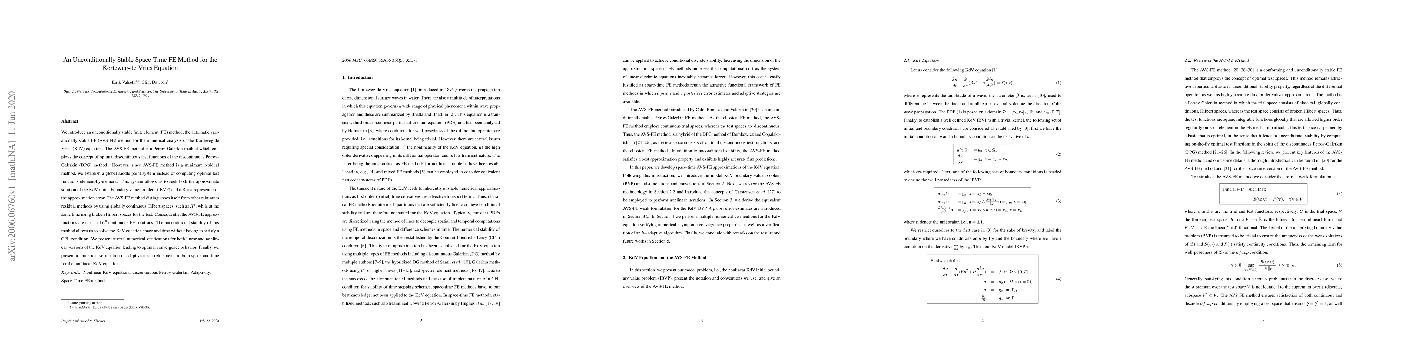 This paper introduces an unconditionally stable finite element method, the AVS-FE method, for solving the Korteweg-de Vries equation. It leverages a global saddle point system to achieve stability without requiring a CFL condition, demonstrating optimal convergence and adaptive mesh refinement capabilities.