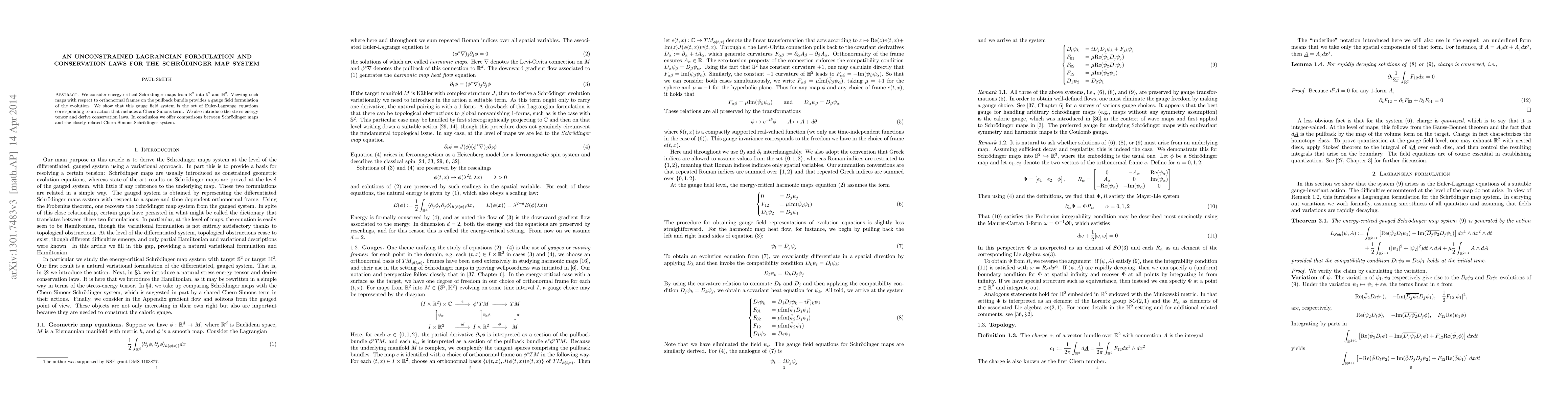This paper presents an unconstrained Lagrangian formulation for energy-critical Schrödinger maps, showing that the gauge field system corresponds to Euler-Lagrange equations with a Chern-Simons term. It also introduces a stress-energy tensor and derives associated conservation laws, comparing the results with the Chern-Simons-Schrödinger system.
