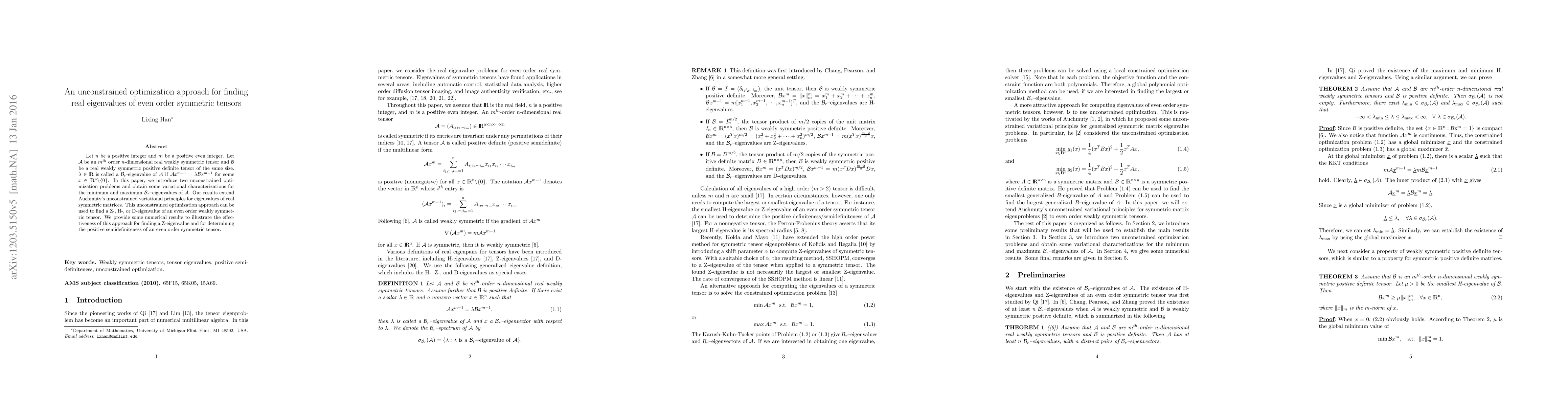 This paper introduces unconstrained optimization methods to find the minimum and maximum eigenvalues of even order symmetric tensors, extending Auchmuty's principles for matrices. Numerical results demonstrate the effectiveness of this approach for identifying Z-eigenvalues and assessing tensor positive semidefiniteness.