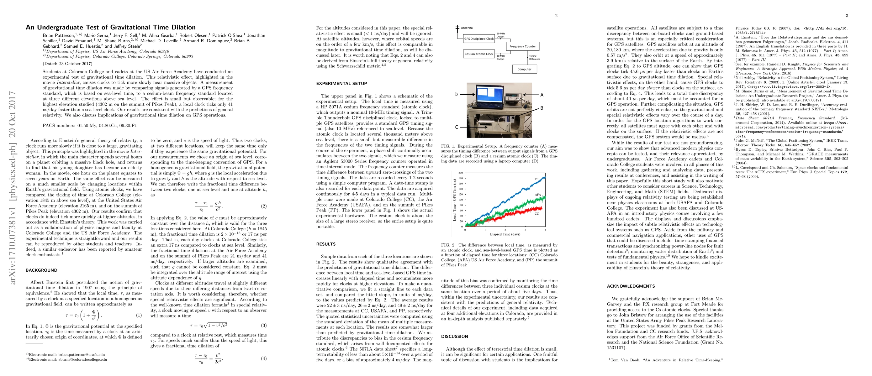 Students at two colleges tested gravitational time dilation, confirming the effect causes clocks to tick more slowly near massive objects. They found a 41 ns/day difference between high-altitude and sea-level clocks, consistent with general relativity predictions.