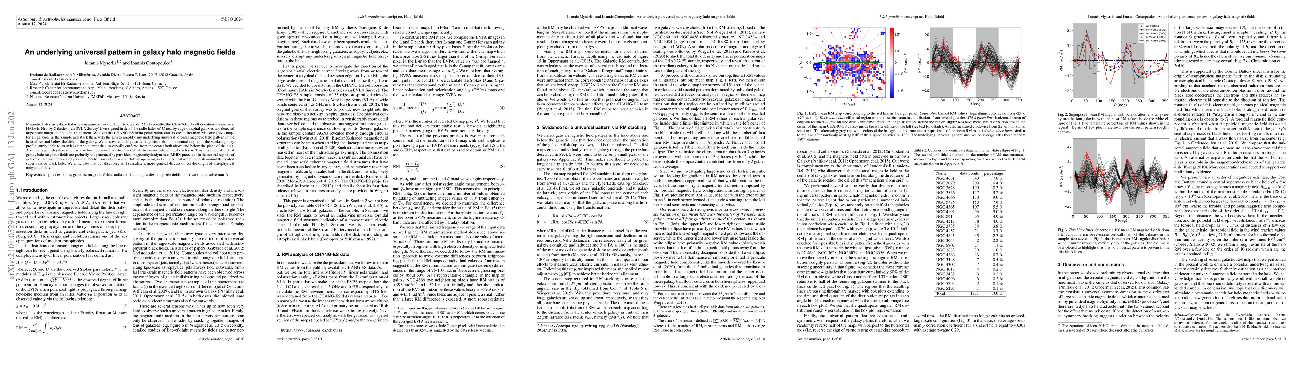 Magnetic fields in galaxy halos are in general very difficult to observe. Most recently, the CHANG-ES collaboration (Continuum HAlos in Nearby Galaxies - an EVLA Survey) investigated in detail the radio halos of 35 nearby edge-on spiral galaxies and detected large scale magnetic fields in 16 of them. We used the CHANG-ES radio polarization data to create Rotation Measure (RM) maps for all galaxies in the sample and stack them with the aim to amplify any underlying universal toroidal magnetic field pattern in the halo above and below the disk of the galaxy. We discovered a large-scale magnetic field in the central region of the stacked galaxy profile, attributable to an axial electric current that universally outflows from the center both above and below the plane of the disk. A similar symmetry-breaking has also been observed in astrophysical jets but never before in galaxy halos. This is an indication that galaxy halo magnetic fields are probably not generated by pure ideal magnetohydrodynamic (MHD) processes in the central regions of galaxies. One such promising physical mechanism is the Cosmic Battery operating in the innermost accretion disk around the central supermassive black hole. We anticipate that our discovery will stimulate a more general discussion on the origin of astrophysical magnetic fields.