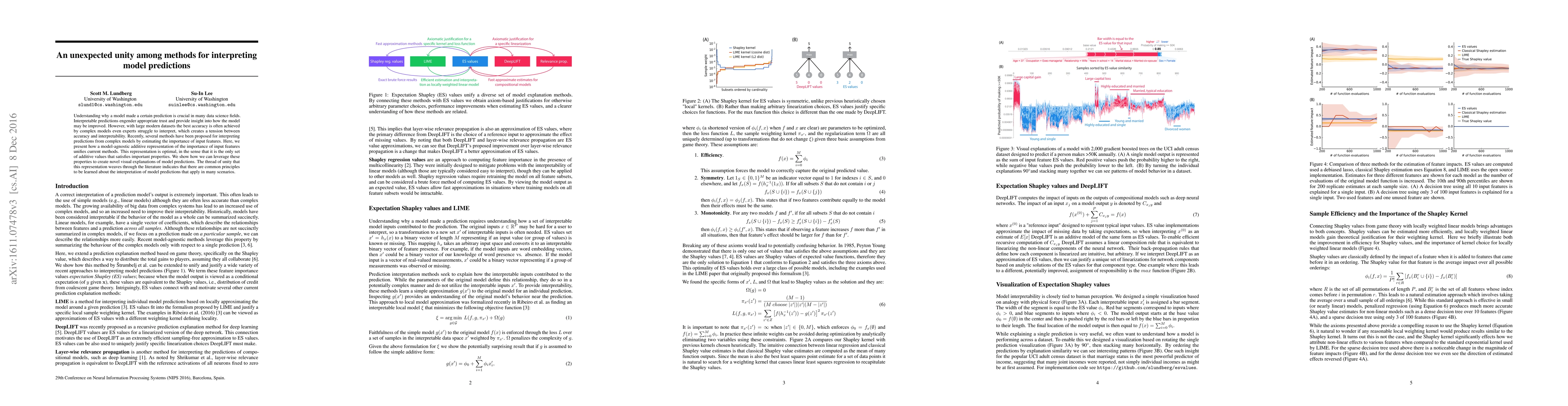 Understanding why a model made a certain prediction is crucial in many data science fields. Interpretable predictions engender appropriate trust and provide insight into how the model may be improved. However, with large modern datasets the best accuracy is often achieved by complex models even experts struggle to interpret, which creates a tension between accuracy and interpretability. Recently, several methods have been proposed for interpreting predictions from complex models by estimating the importance of input features. Here, we present how a model-agnostic additive representation of the importance of input features unifies current methods. This representation is optimal, in the sense that it is the only set of additive values that satisfies important properties. We show how we can leverage these properties to create novel visual explanations of model predictions. The thread of unity that this representation weaves through the literature indicates that there are common principles to be learned about the interpretation of model predictions that apply in many scenarios.